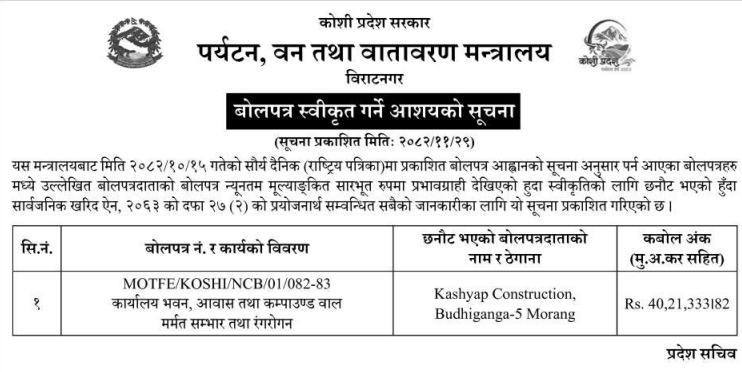 प्रदेश १ मा प्रकाशित निर्माण सम्बन्धी बोलपत्र तथा आशयका सुचनाहरु