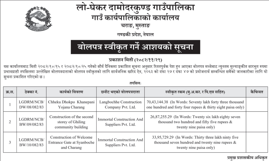 | 64 | Integrated Service Office, Mustang | Construction of Barcha Aama Samuha, Furniture Kharid Tatha Sttaronnati, Lomanthang Ga.Pa.-2, Bharcha, Mustang | 12/03/2026 | PPMO | 29/03/2026 | Click Here | |