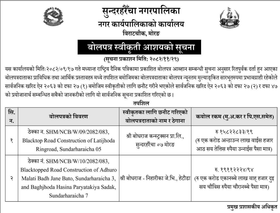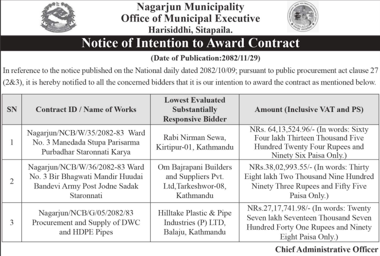 - Award Notice : Road Upgrading Work At Various Places (Swornikita Construction and Suppliers, Gatishil-Gravity JV) |