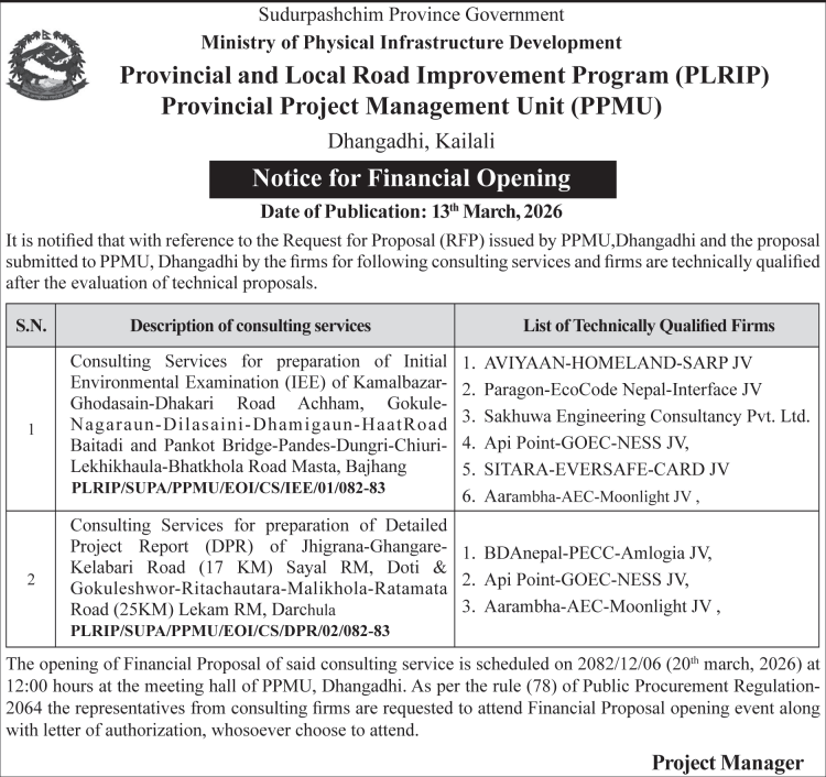 | 98 | Punarbas Municipality Office, Sudurpaschim Province, KANCHANPUR; | Construction of Incomplete Blacktop Road From Nar Singh Chock to West Punarbas-03, Kanchanpur. | 12/03/2026 | PPMO | 27/03/2026 | Click Here | |