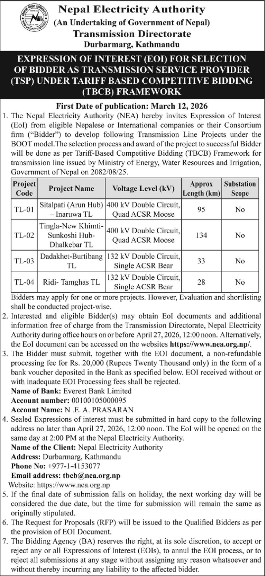 | 67 | NEA, Duhabi Grid Department | Tower Protection Works of Tower No. 820 (132 KV Transmission Line, Duhabi-Kusaha Section, Thalaha Khola, Gadhi, Sunsari) | 12/03/2026 | PPMO | 29/03/2026 | Click Here | |