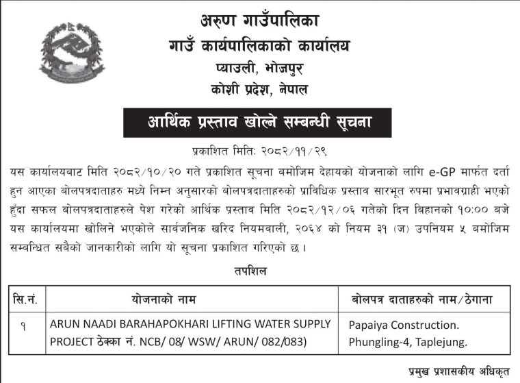 | 104 | Chingadgaupalika, Surkhet | Dopke Sisnupole Aarukharka Lift Khanepani Yojana Three Phase Bidhut Bistar | 12/03/2026 | PPMO | 26/03/2026 | Click Here | |