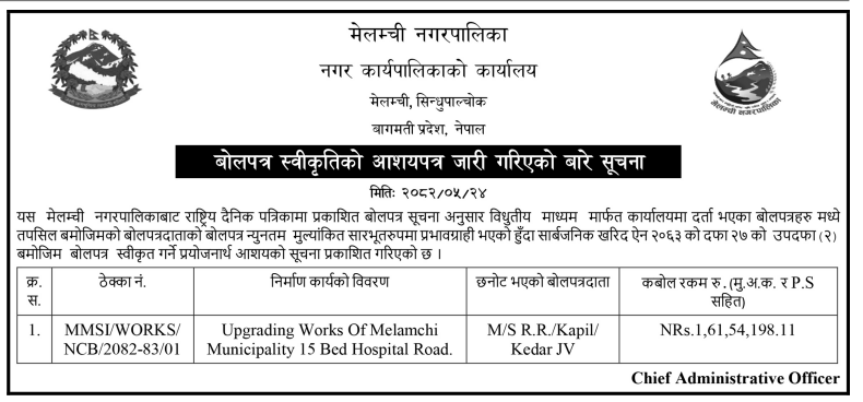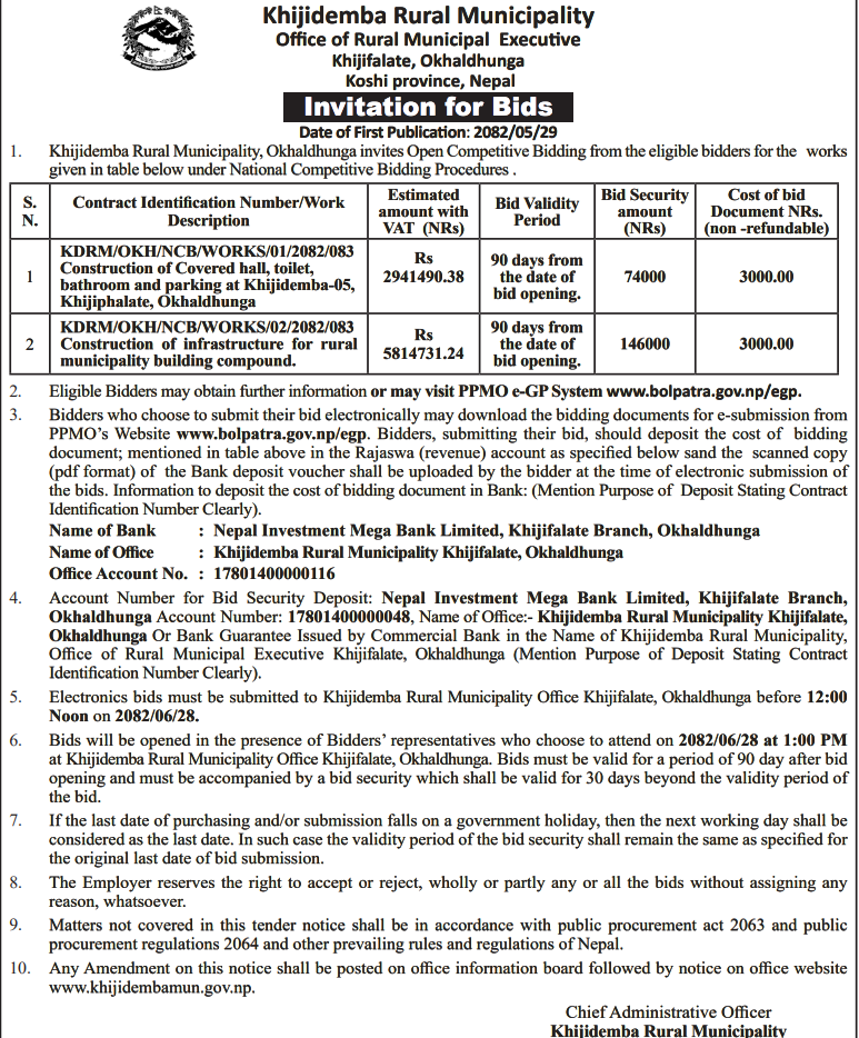 | 12 | Tamakoshi Rural Municipality,Dolakha | Upgrading Works Of Kirnebesi-Kirnegaun Ritthabot Kalleri Malu Dadagaun Road. | 09/09/2025 | Ppmo | 09/10/2025 | Click Here | |
