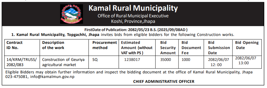 | 44 | Gauradaha Municipality, Office of the Municipal Executive,Gauradaha,Jhapa,Koshi Province, Nepal | CONSTRUCTION OF BLACKTOP ROAD AND OTHER STRUCTURES ALONG HIMAL CHOWK-HANSKHORA-MADAL DADA-DALHU ,GAURADAHA-02,JHAPA,NEPAL | 09/09/2025 | Ppmo | 09/10/2025 | Click Here | |