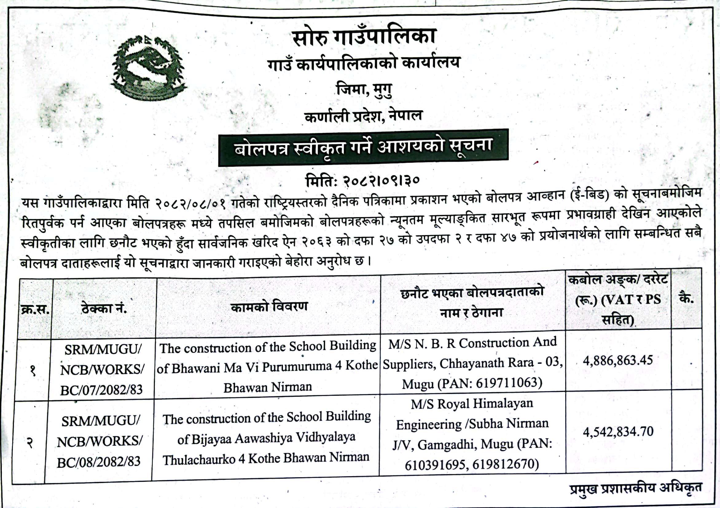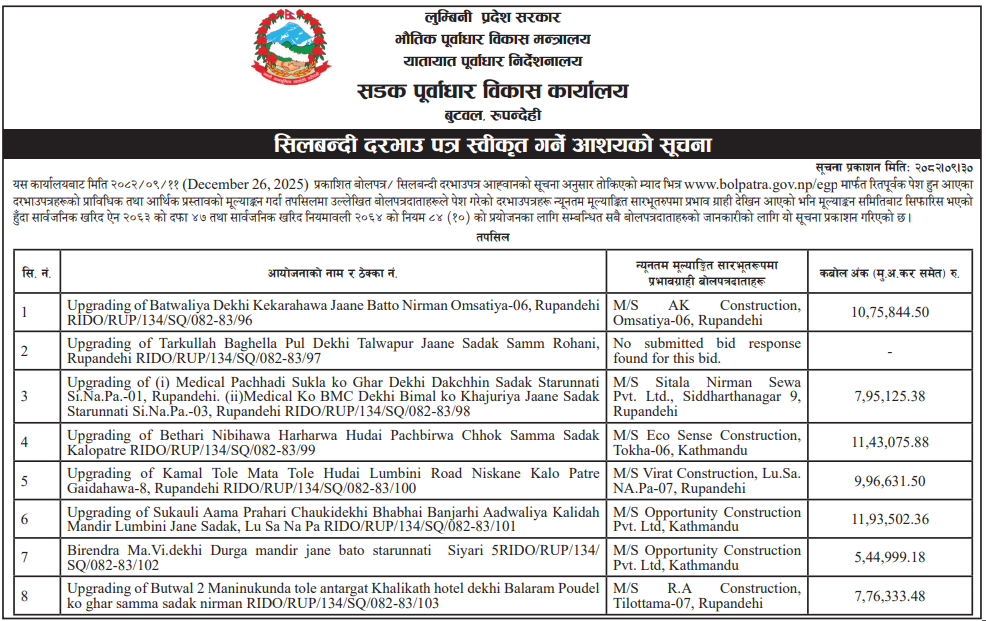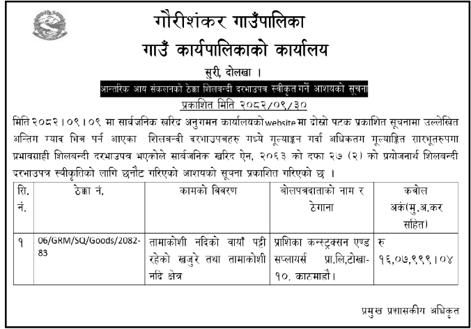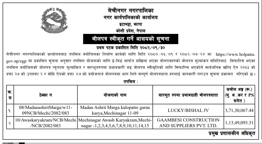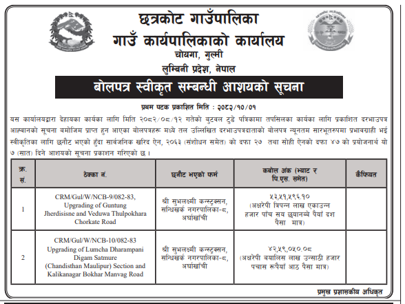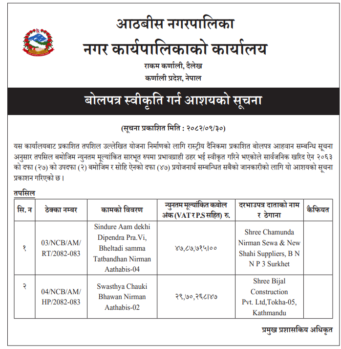 बोलपत्र स्विकृत ; Bid Award (Construction only) 15/01/2025 (Thursday)