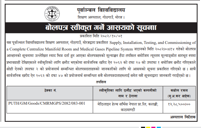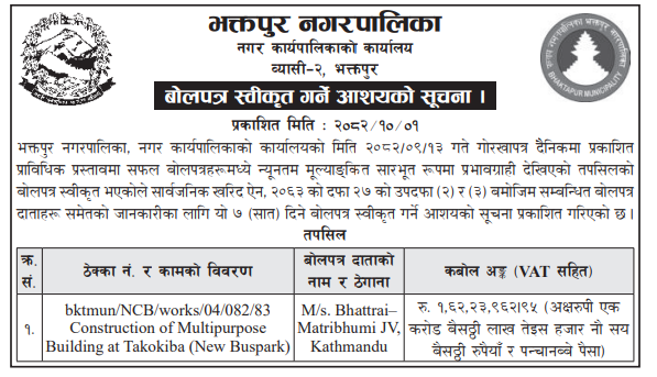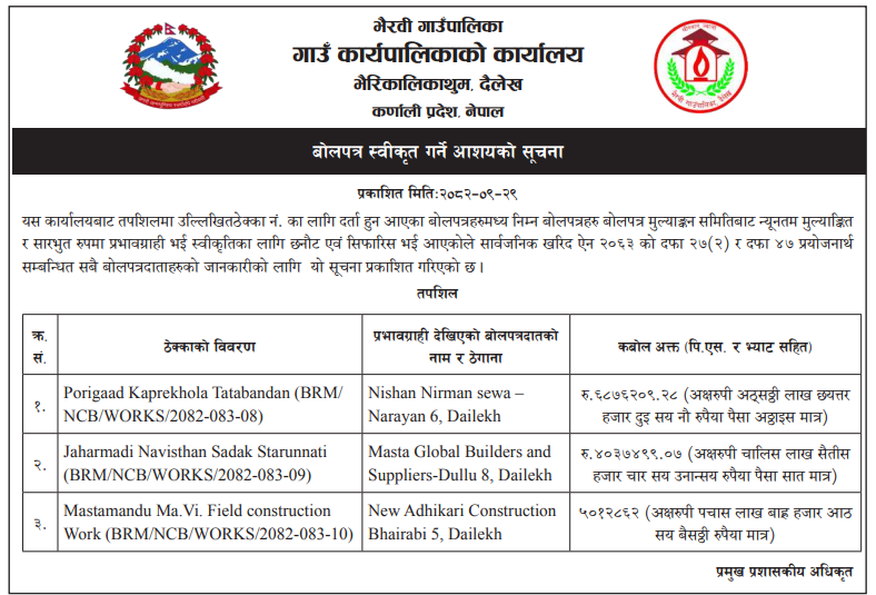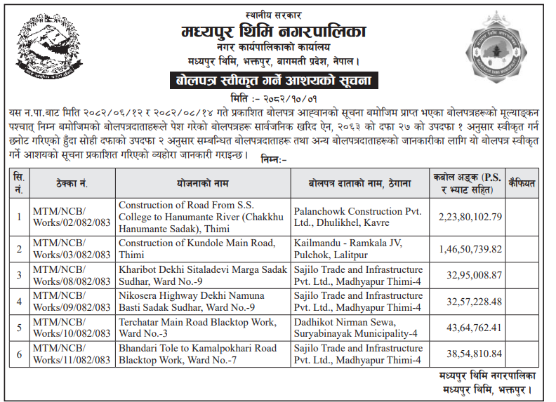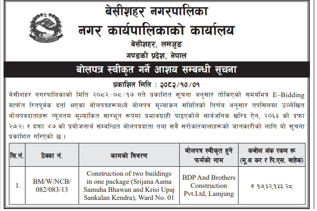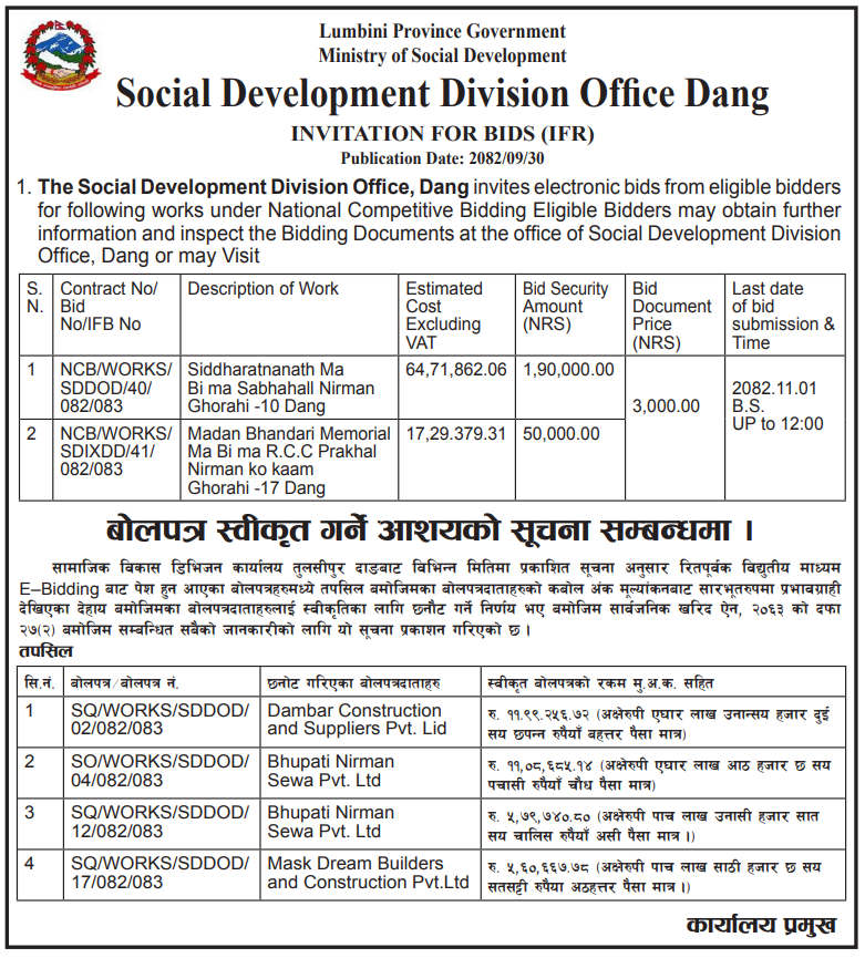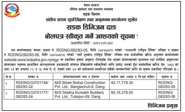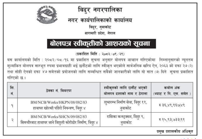 बोलपत्र स्विकृत ; Bid Award (Construction only) 15/01/2025 (Thursday)