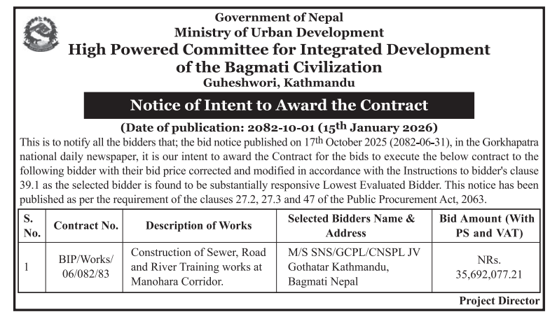 | 8 | Water Supply and Sanitation Division Office, Baglung, Gandaki Province | Construction and Procurement of Syangkhudi Ardhanareshwor Water Supply Project, Pokhara-28,Kaski | 14/01/2026 | PPMO | 13/02/2026 | Click Here | |
