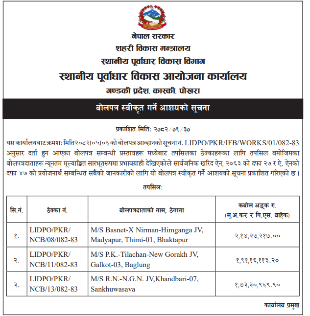 | 12 | Pokhara Metropolitan City Office | Construction of Okhle Lifting Water Supply Project, PMC-28 (Contract ID: 55/PMC/NCB/W/Purbadhar/082-83) | 14/01/2026 | PPMO | 13/02/2026 | Click Here | |