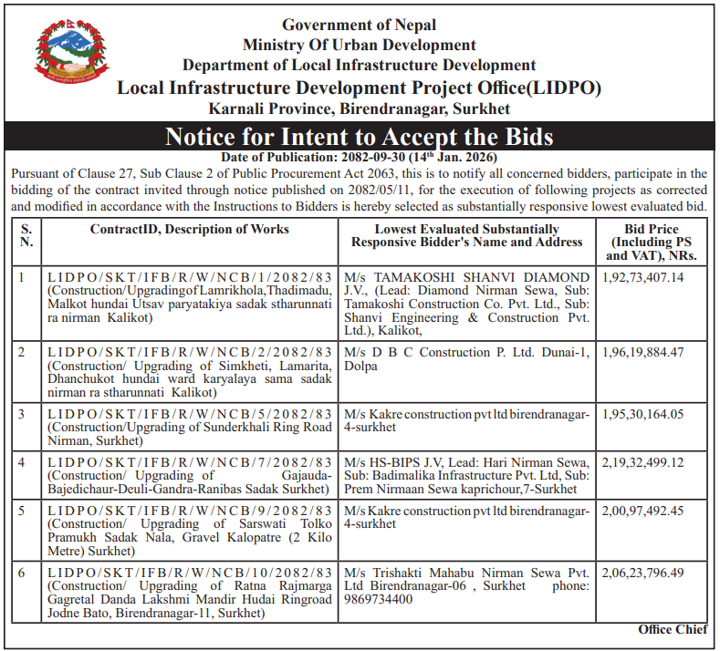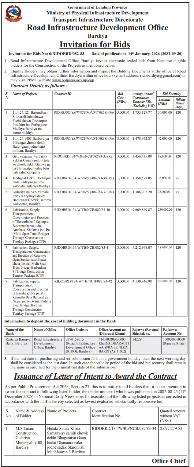 | 43 | Infrastructure Development Office, Bhojpur | Upgrading Works of i) Hatuwagadhi Gaunpalika wada no. 6 prajatantra ma.bi. PingDanda Tol bata Dhara tol Khelmaidan Samma Sadak, Bhojpur ii) Pangcha Lasune krishi sadak wada no. 10, Bhojpur | 14/01/2026 | PPMO | 16/02/2026 | Click Here | |