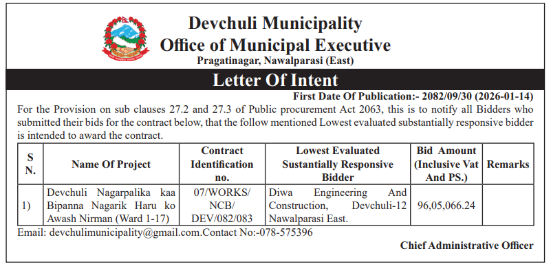 | 9 | Devchuli Municipality, Nawalparasi-East | construction Of Deep Boring and Installation Electric motor and all complete work in Devchuli municipality-17. | 14/01/2026 | PPMO | 13/02/2026 | Click Here | |