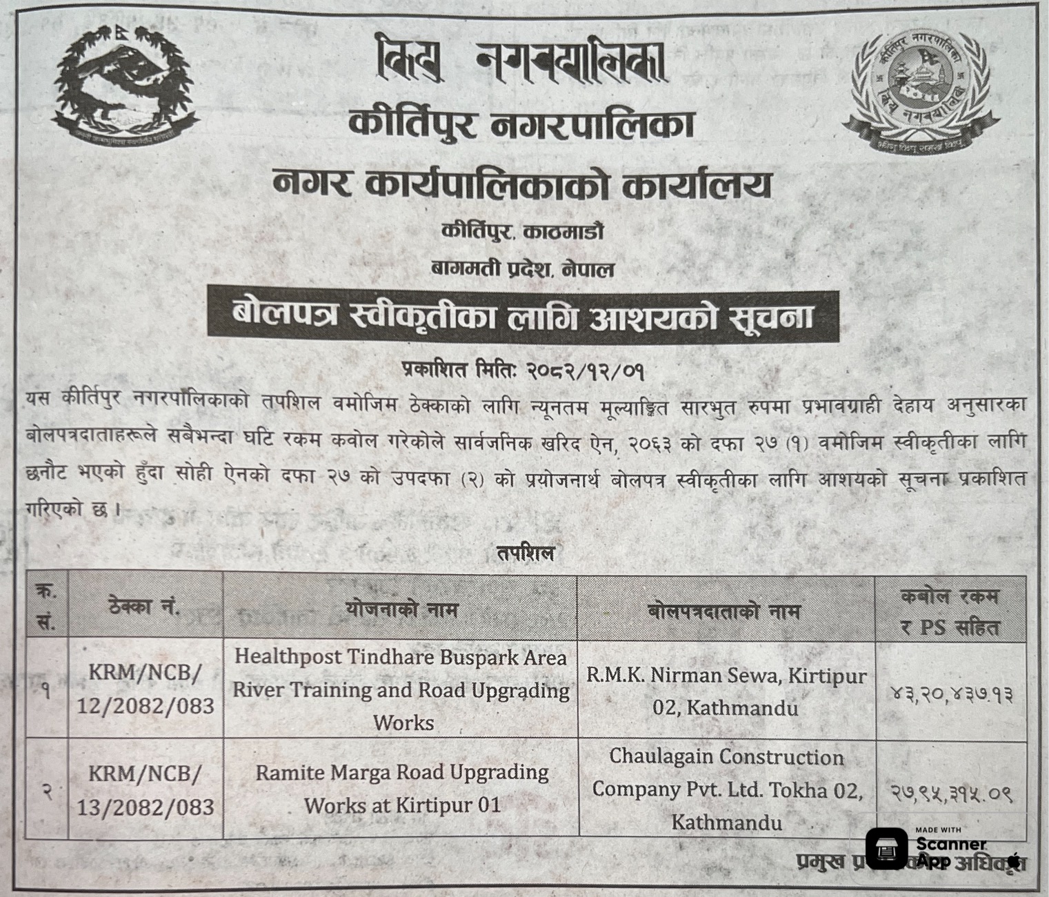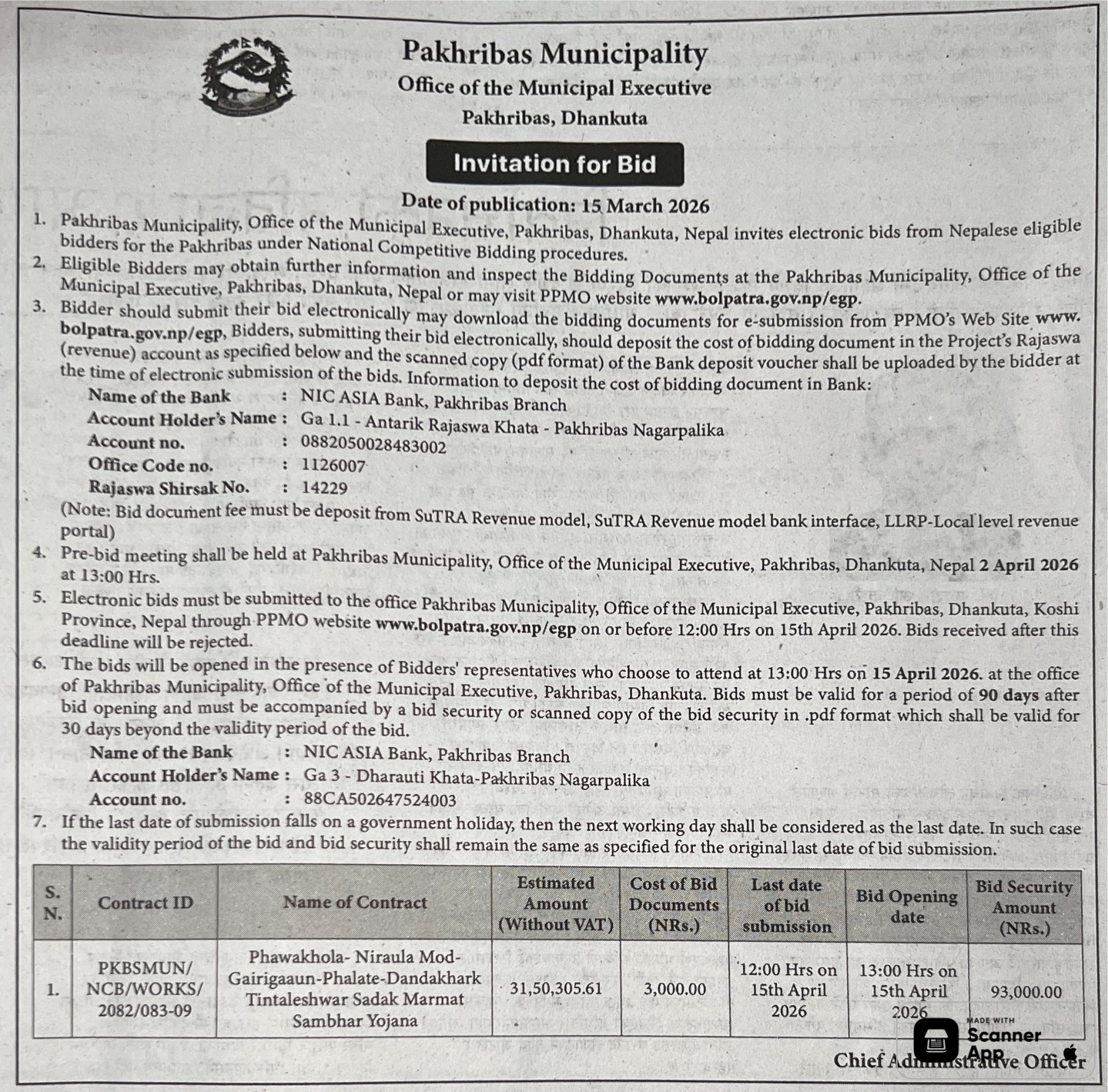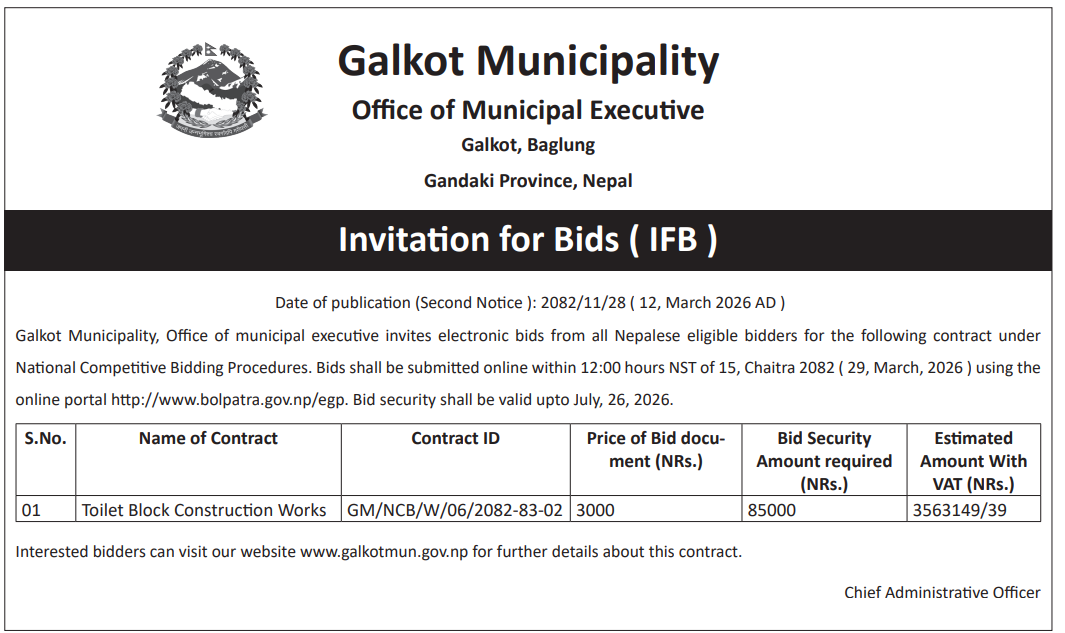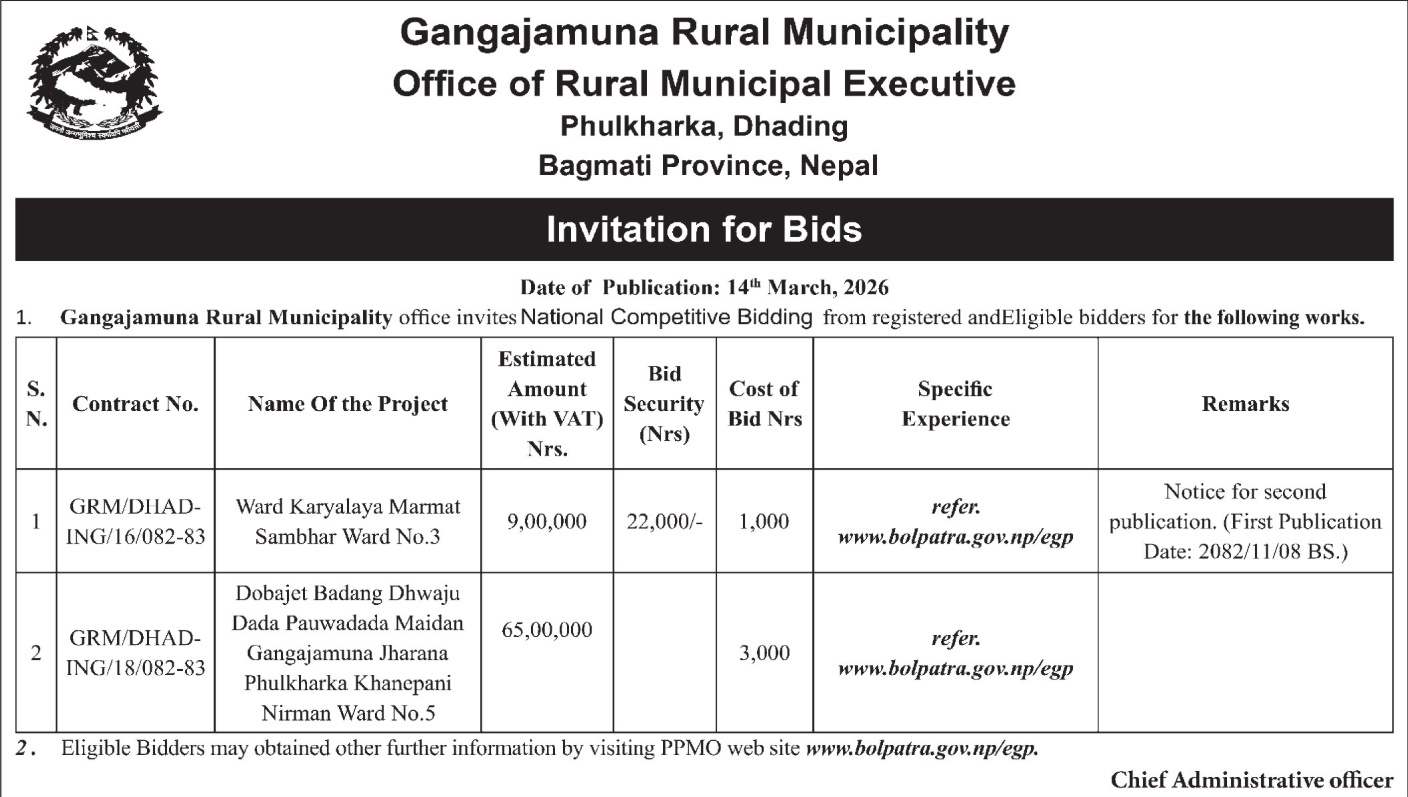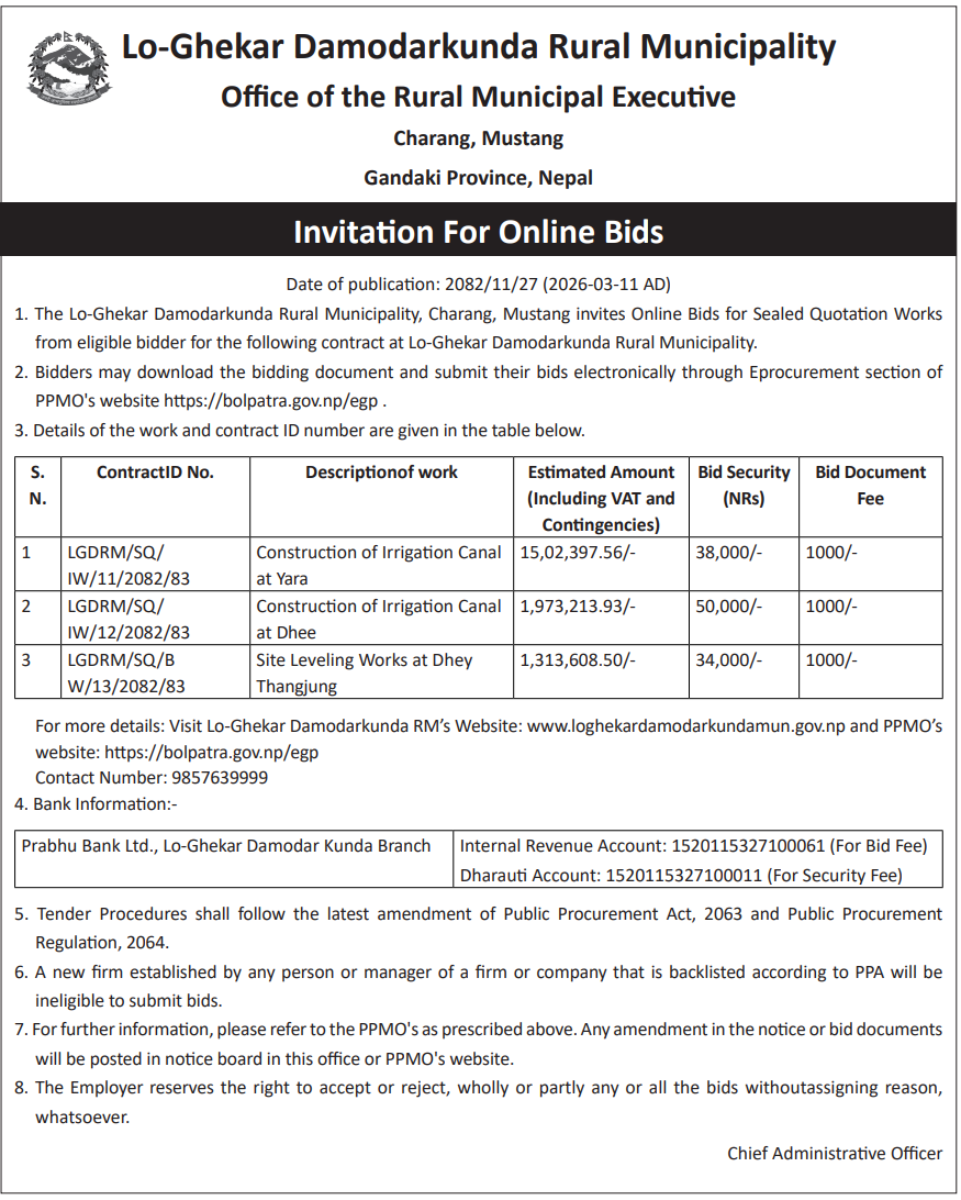 | 23 | Palungtar Municipality Office, Gandaki Province, GORKHA; | Sustainable Collection & Extraction of River Bed Materials from Bhandari phat Ghaat ( Chepe Nadi),Palungtar-03,Gorkha | 13/03/2026 | PPMO | 12/04/2026 | Click Here | |