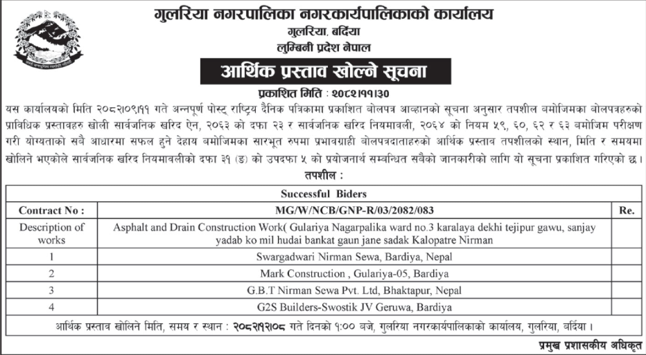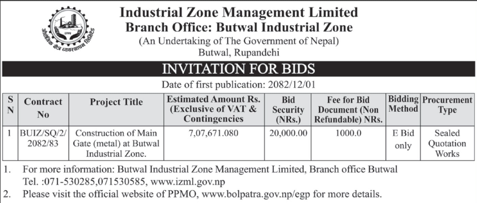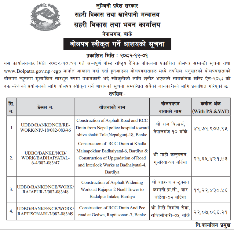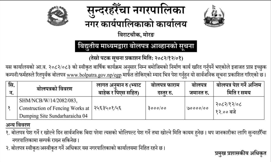 | 1 | Sunwal Municipality Office, Lumbini Province, NAWALPARASI WEST; | Waste Management Access Road, Sunwal-04 | 13/03/2026 | PPMO | 12/04/2026 | Click Here | |