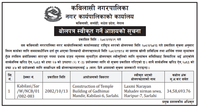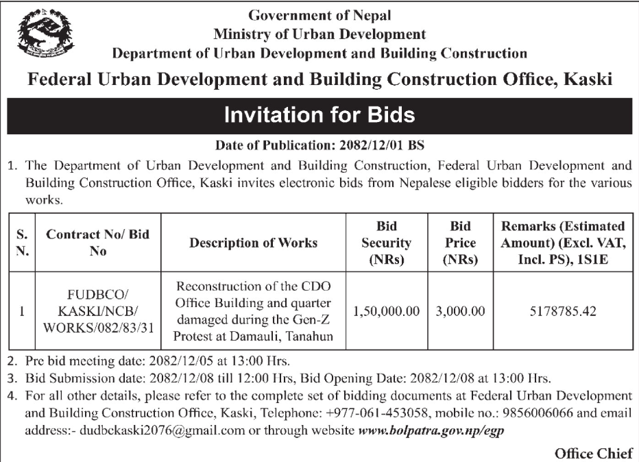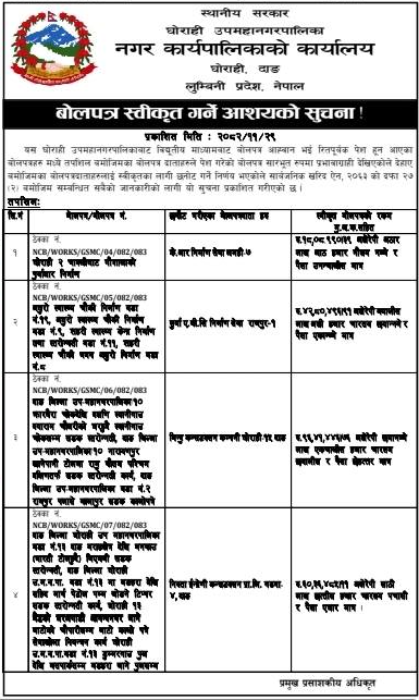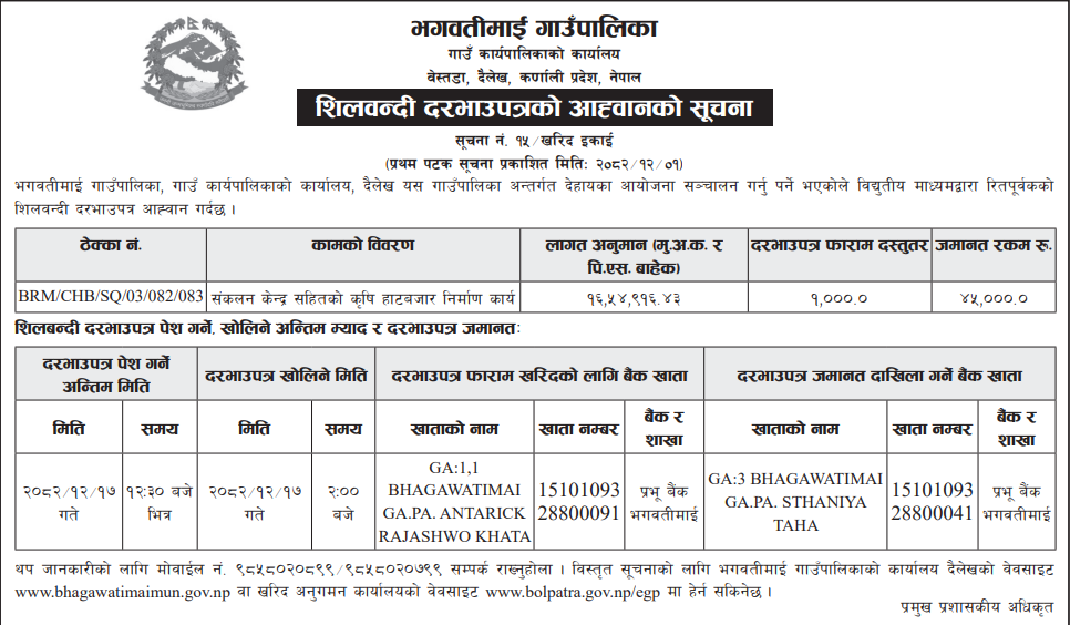 | 6 | Buddhabhumi Municipality Office, Kapilbastu | GAUDHI TAAL BUDDHABHUMI MUNICIPALITY-4,GELWAR | 13/03/2026 | PPMO | 12/04/2026 | Click Here | |
