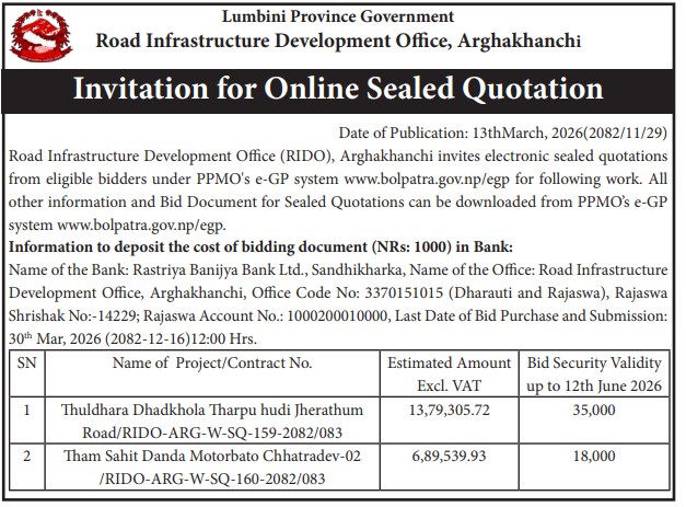 | 20 | Malarani Rural Municipality Office, Lumbini Province, ARGHAKHANCHI; | upgradation of nubalitola-chudare khet-thama -khoraka neta motarable road | 13/03/2026 | PPMO | 12/04/2026 | Click Here | |