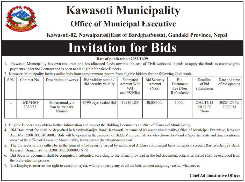 | 50 | Kawasoti Muncipality | Shiba samudayik ban bhitra park Nirman | 13/03/2026 | PPMO | 29/03/2026 | Click Here | |