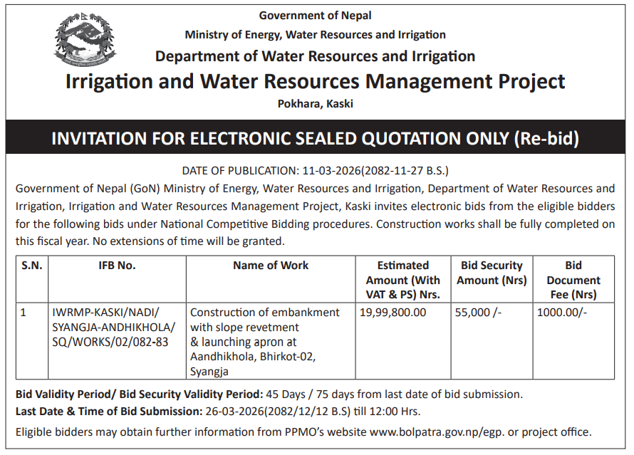 | 153 | Water Resources And Irrigation Development Division, Kaski | Construction and Maintenance of Checkdam and Revetment at Jogimadi Kalikhola, Pokhara-16,20 Kaski. | 13/03/2026 | PPMO | 13/04/2026 | Click Here | |
