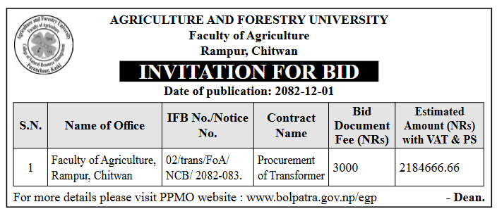 | 155 | Faculty of Agriculture, Office of the Dean, Rampur Chitwan | Lab Maintenance works. | 13/03/2026 | PPMO | 12/04/2026 | Click Here | |