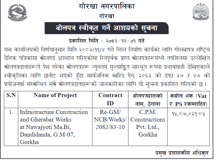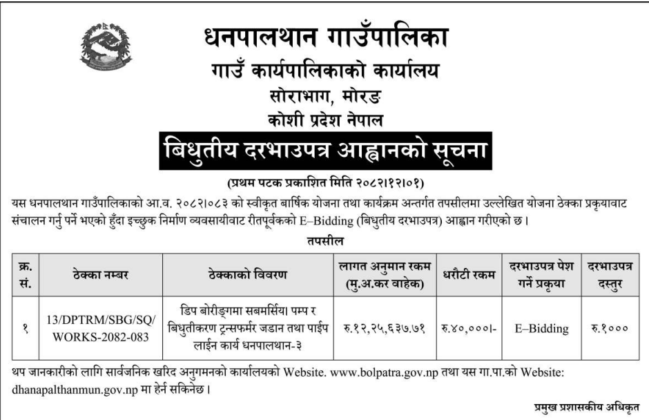 | 24 | Palungtar Municipality Office, Gandaki Province, GORKHA; | Sustainable Collection & Extraction of River Bed Materials from Bimere Dovan Ghaat ( Daraundi River) Palungtar-01,Gorkha | 13/03/2026 | PPMO | 12/04/2026 | Click Here | |