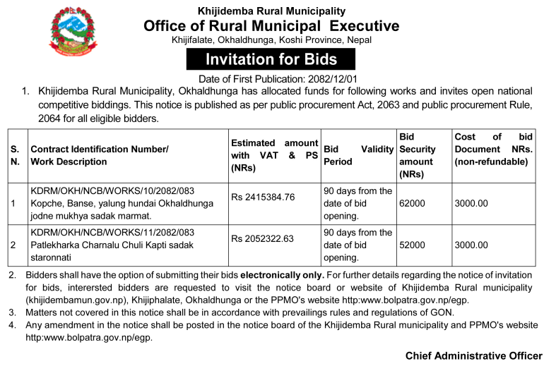 | 21 | Mahankal Rural Municipality Office, Bagmati Province, LALITPUR; | Japka sisban deurali sadak starronati wada 3 naya kam | 13/03/2026 | PPMO | 12/04/2026 | Click Here | |