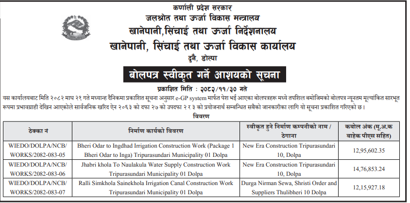 प्रदेश ६ मा प्रकाशित निर्माण सम्बन्धी बोलपत्र तथा आशयका सुचनाहरु