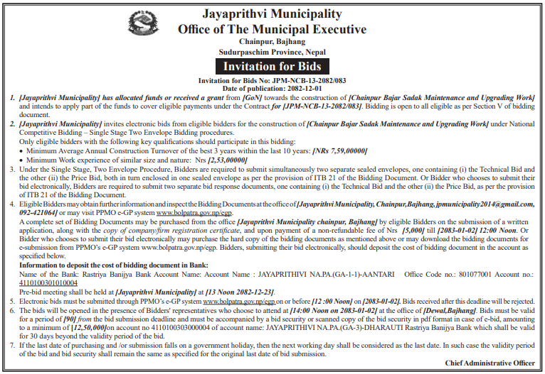| 17 | Jayaprithivi Municipality, Bajhang | Administrative Building Construction Work of Jayaprithvi Municipality | 13/03/2026 | PPMO | 12/04/2026 | Click Here | |