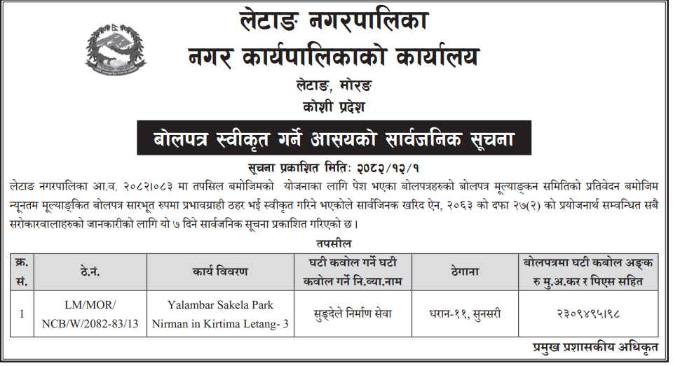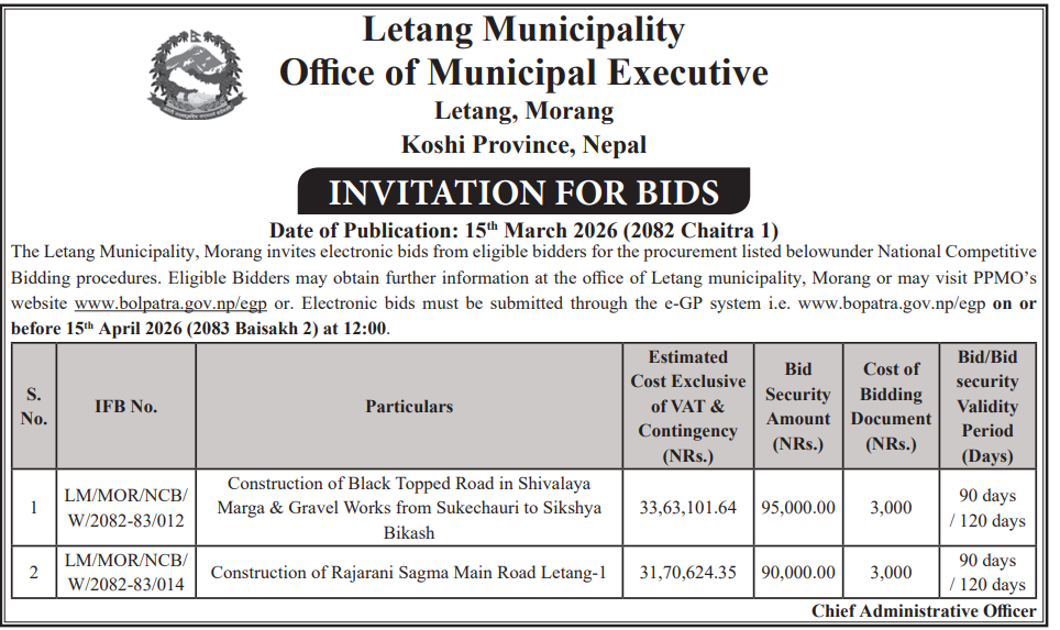 | 18 | Letang Municipality, Morang | Upgrading of Fedapjung Road Letang 7 Morang | 13/03/2026 | PPMO | 12/04/2026 | Click Here | |