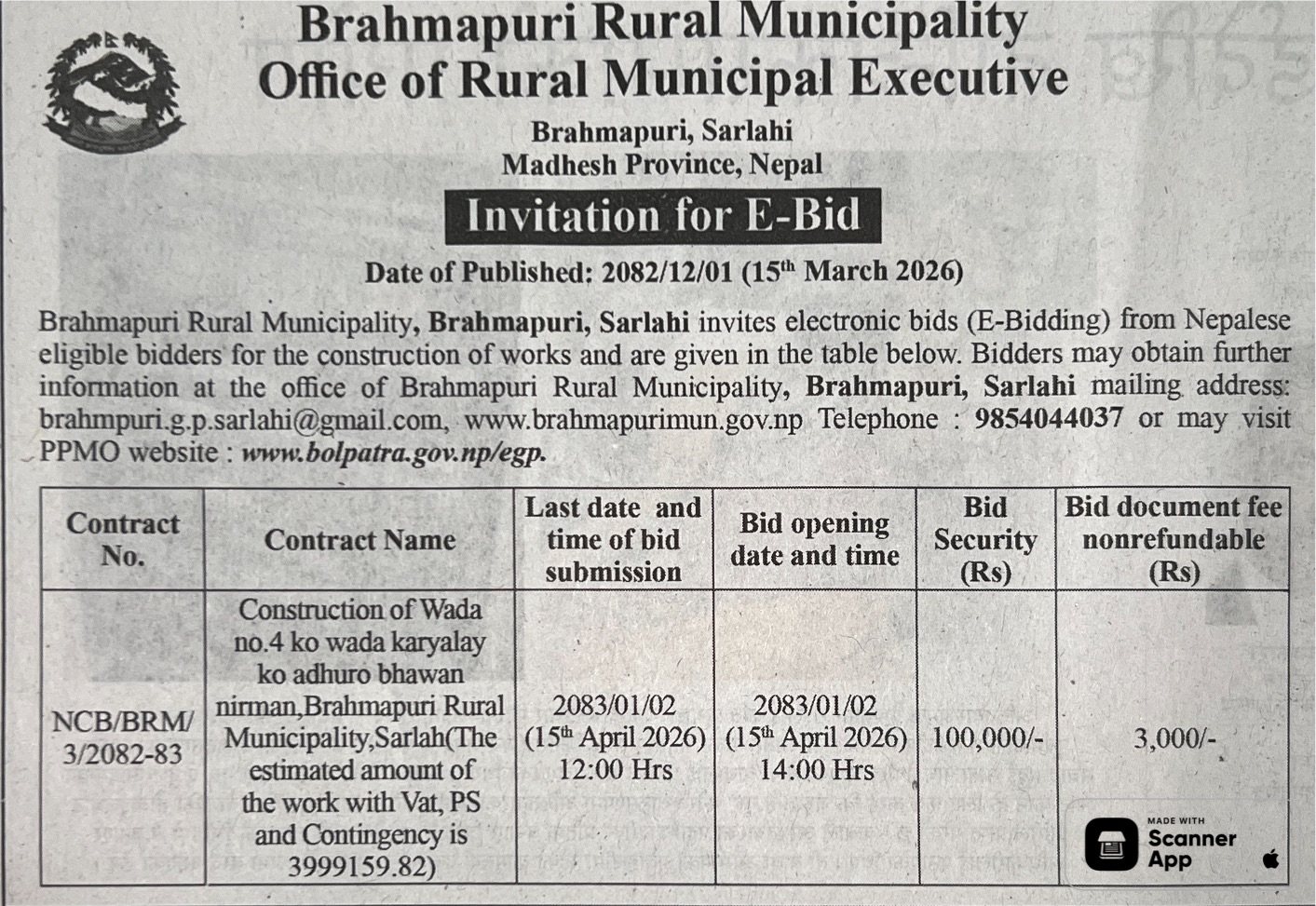 | 52 | Bharatpur Metropolitian City Office | Ward Office Maintenance Works of BMC-10 | 13/03/2026 | PPMO | 29/03/2026 | Click Here | |