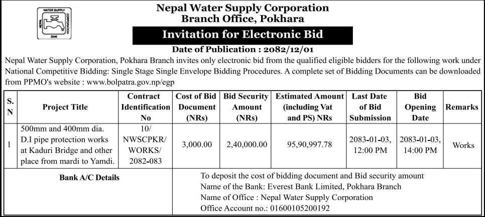 | 114 | Water Supply and Sewerage Management Office, Pokhara | Supply and delivery of Various Fittings for different Water Supply Projects | 13/03/2026 | PPMO | 12/04/2026 | Click Here | |