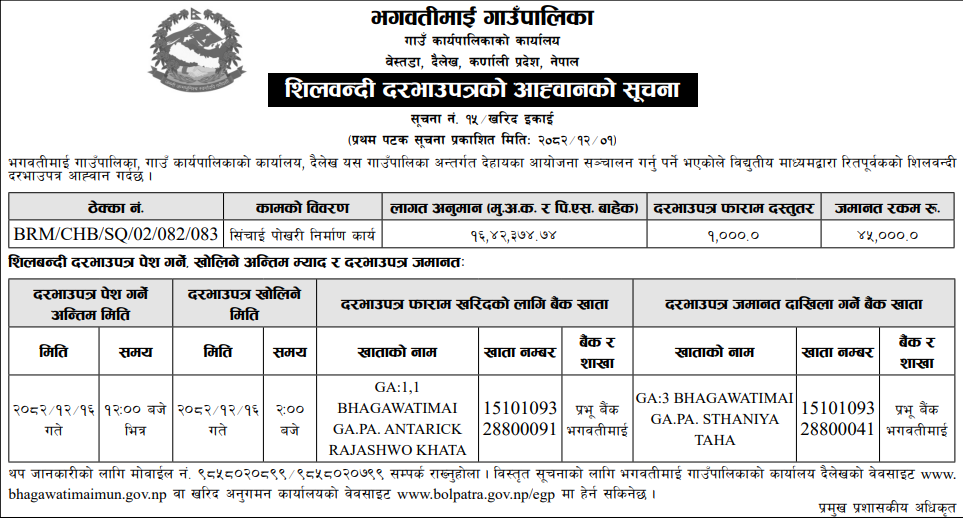 | 45 | Gauriganga Municipality, Chaumala Kailali | Judhiya Taal Sanrakshan Tatha Paryatan Prawardan ward no 4 | 13/03/2026 | PPMO | 30/03/2026 | Click Here | |