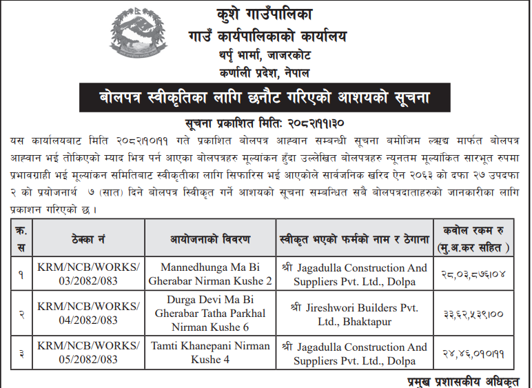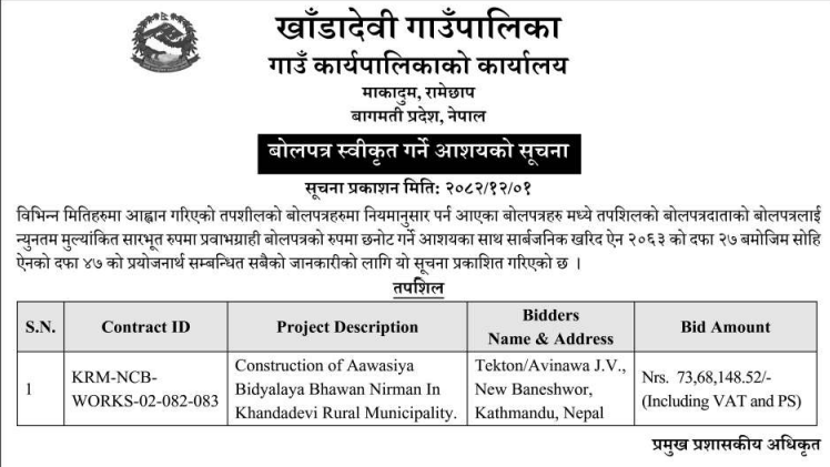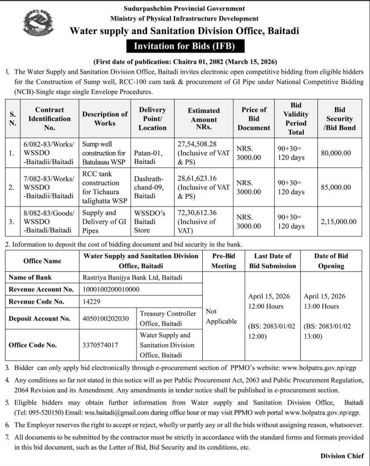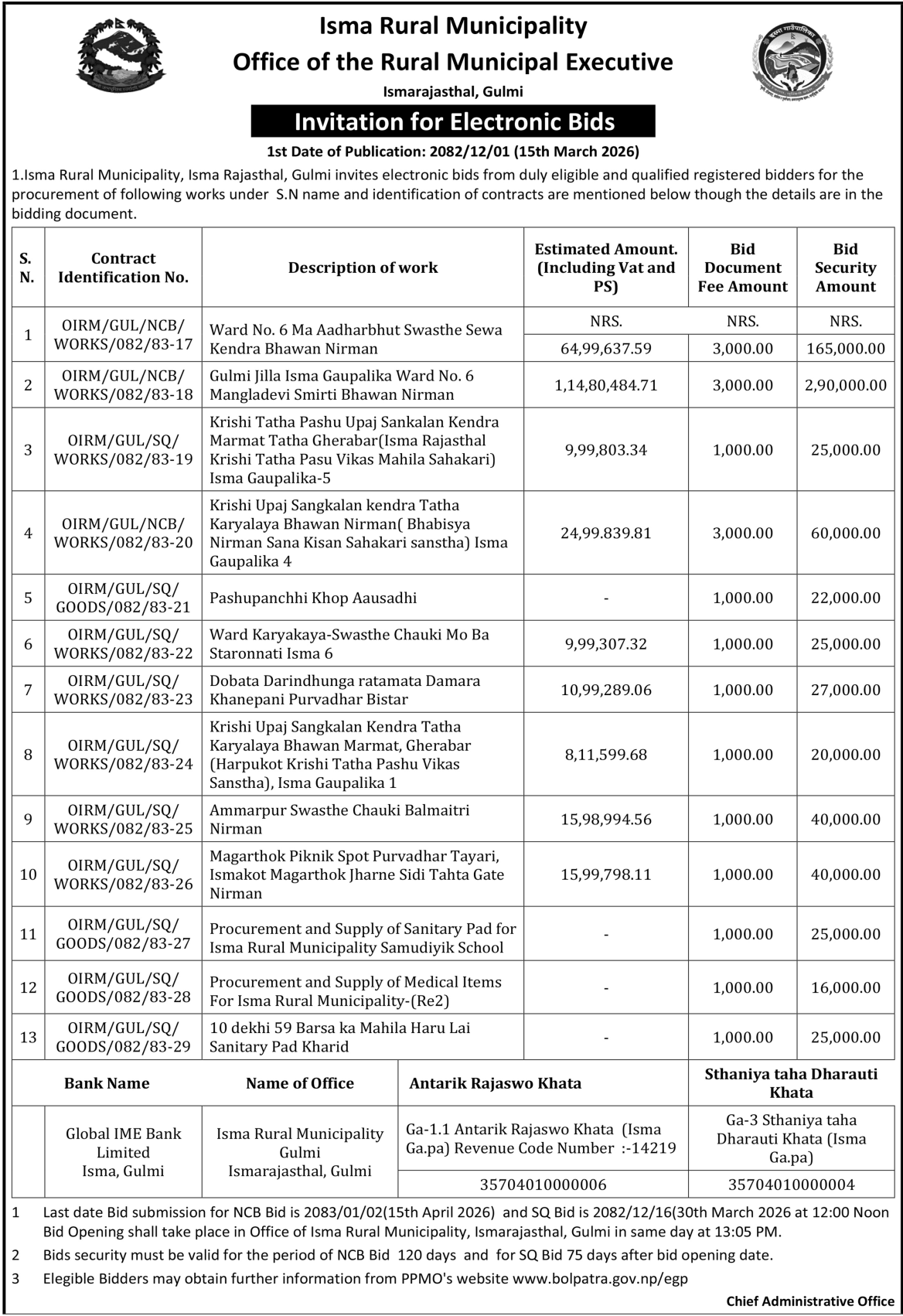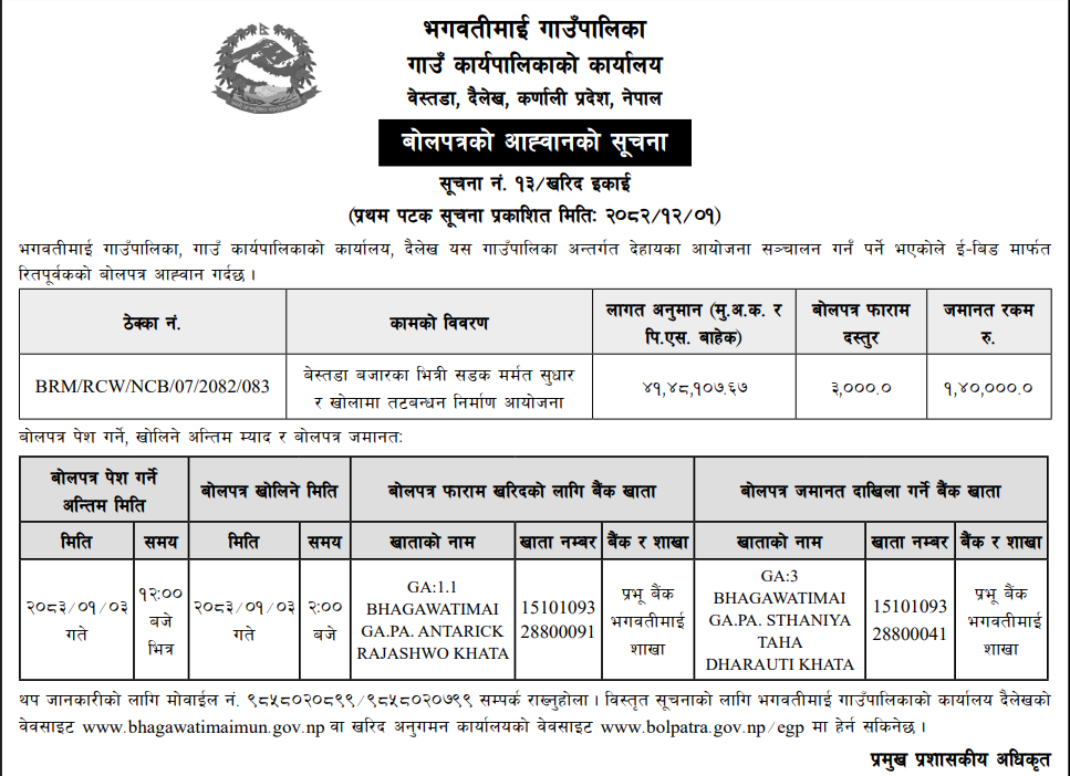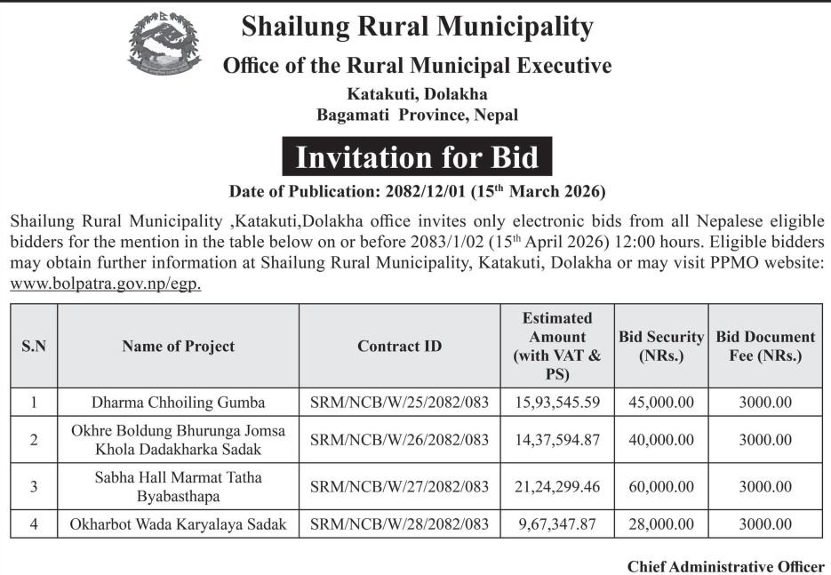 | 10 | Baiteshwor Rural Municipality Office, Bagmati Province, DOLAKHA; | Namdu Swasthya Chauki Bhawan Wada No.6 | 13/03/2026 | PPMO | 12/04/2026 | Click Here | |