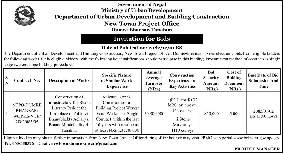 | 150 | Ratnanagar Municipality Office, Bagmati Province, CHITWAN; | Construction of Hariyali Park (Phase-II), Ward-10 | 13/03/2026 | PPMO | 13/04/2026 | Click Here | |