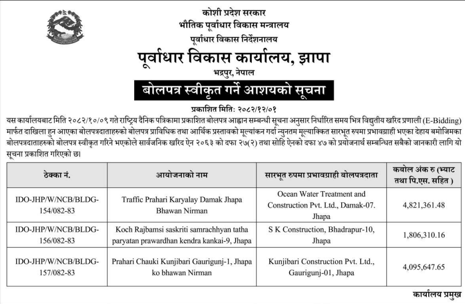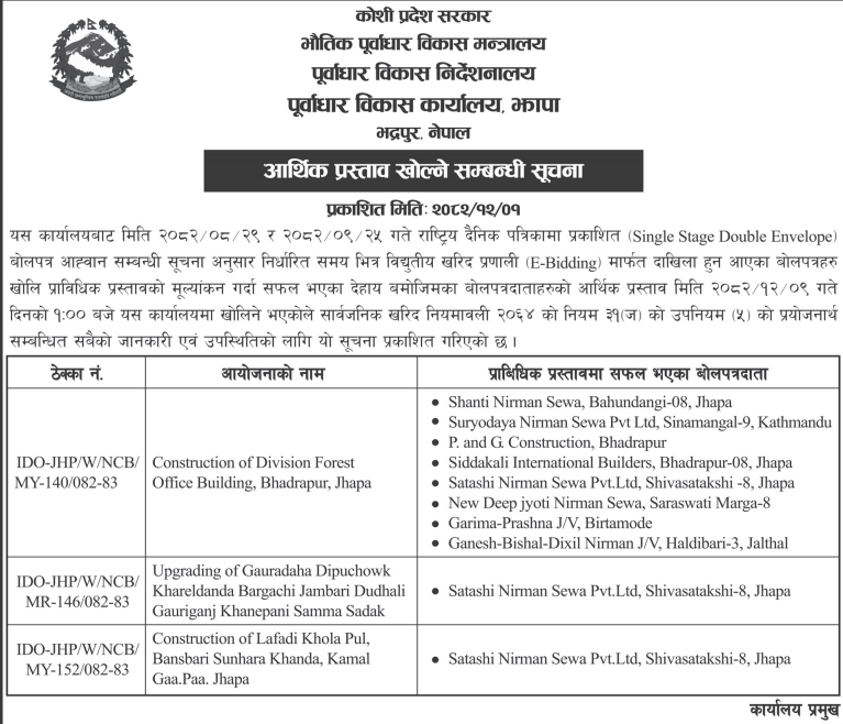 प्रदेश १ मा प्रकाशित निर्माण सम्बन्धी बोलपत्र तथा आशयका सुचनाहरु
