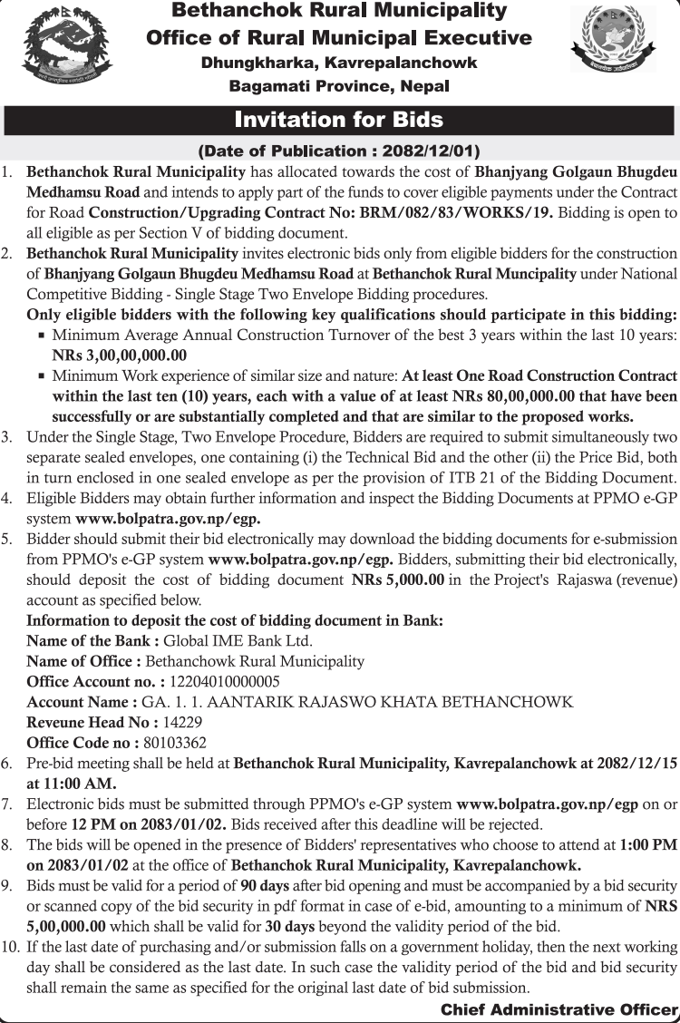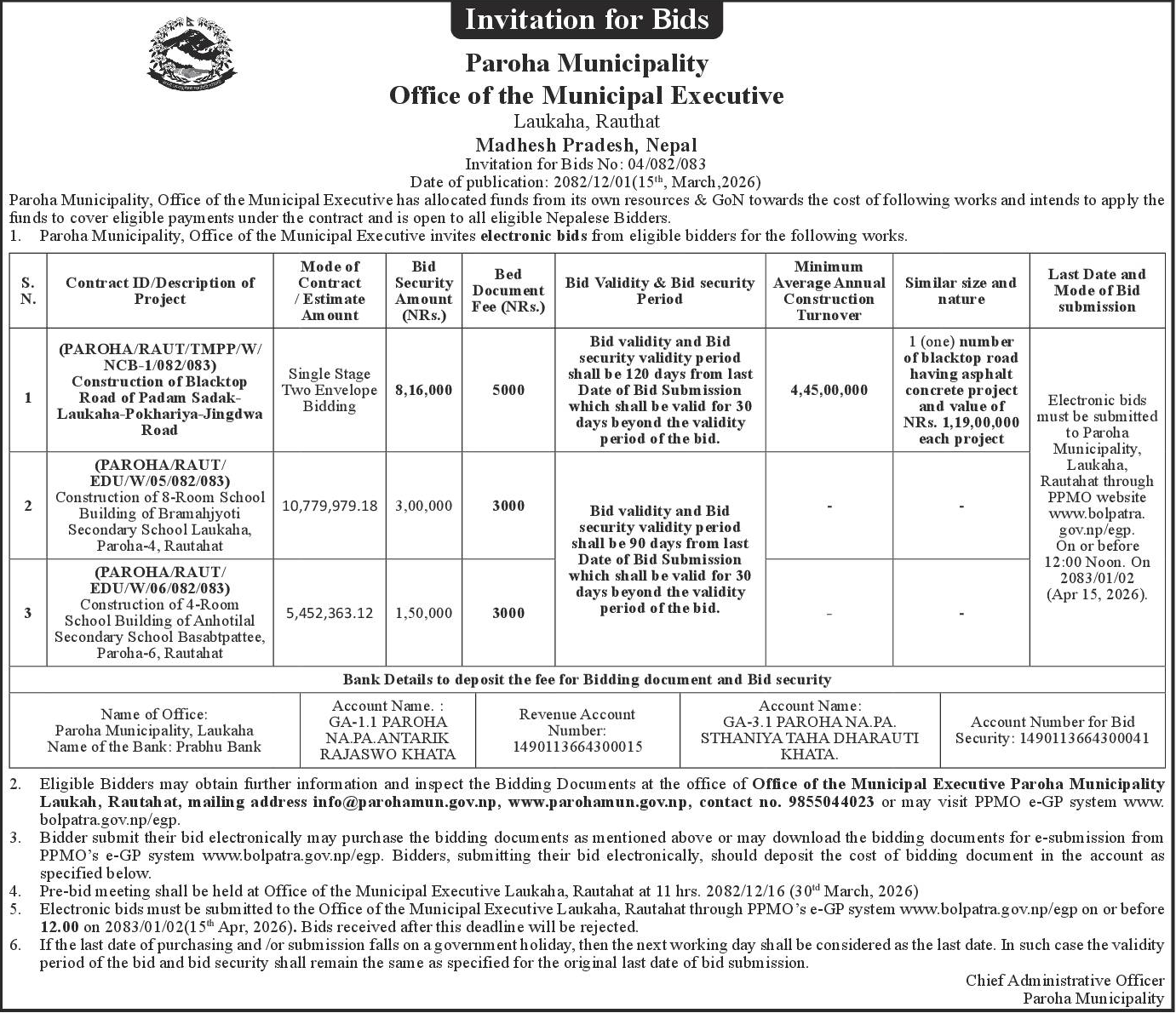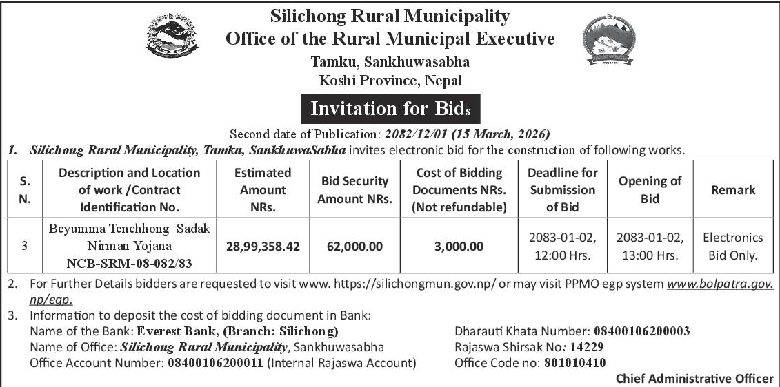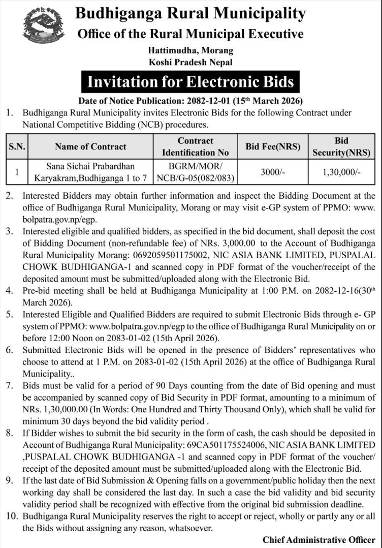| 12 | Baiteshwor Rural Municipality Office, Bagmati Province, DOLAKHA; | Construction of Interlocking Concrete Paver Block Roads and Plum Concrete Retaining Walls at Various Locations in Ward No. 04, 06 & 07, Birtamode Municipality, Jhapa | 13/03/2026 | PPMO | 12/04/2026 | Click Here | |