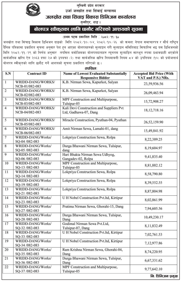 प्रदेश ७ मा प्रकाशित निर्माण सम्बन्धी बोलपत्र तथा आशयका सुचनाहरु