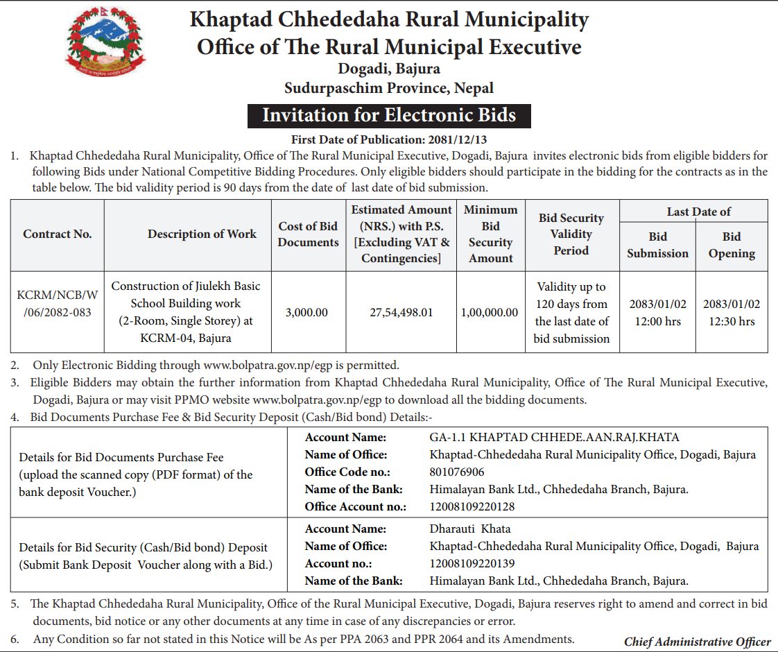 | 53 | Badimalika Municipality, Bajura | KAILASH MABI SCHOOL BOUNDARY AND FIELD NIRMAN AT BADIMALIKA MUNICIPALITY 06, KORDHA, BAJURA | 13/03/2026 | PPMO | 29/03/2026 | Click Here | |