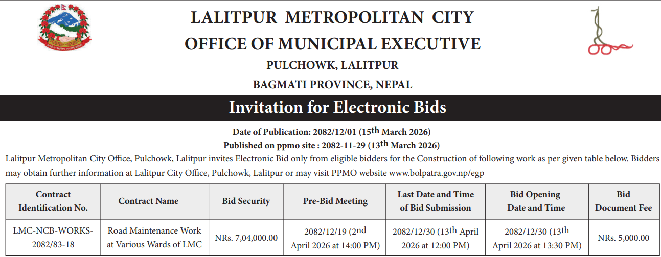 | 148 | Lalitpur Metropolitan City Office | ROAD MAINTENANCE WORK AT VARIOUS WARDS OF LMC | 13/03/2026 | PPMO | 13/04/2026 | Click Here | |