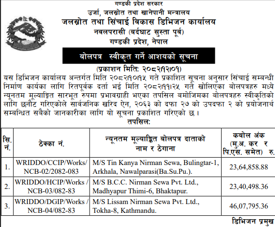 प्रदेश ४ मा प्रकाशित निर्माण सम्बन्धी बोलपत्र तथा आशयका सुचनाहरु