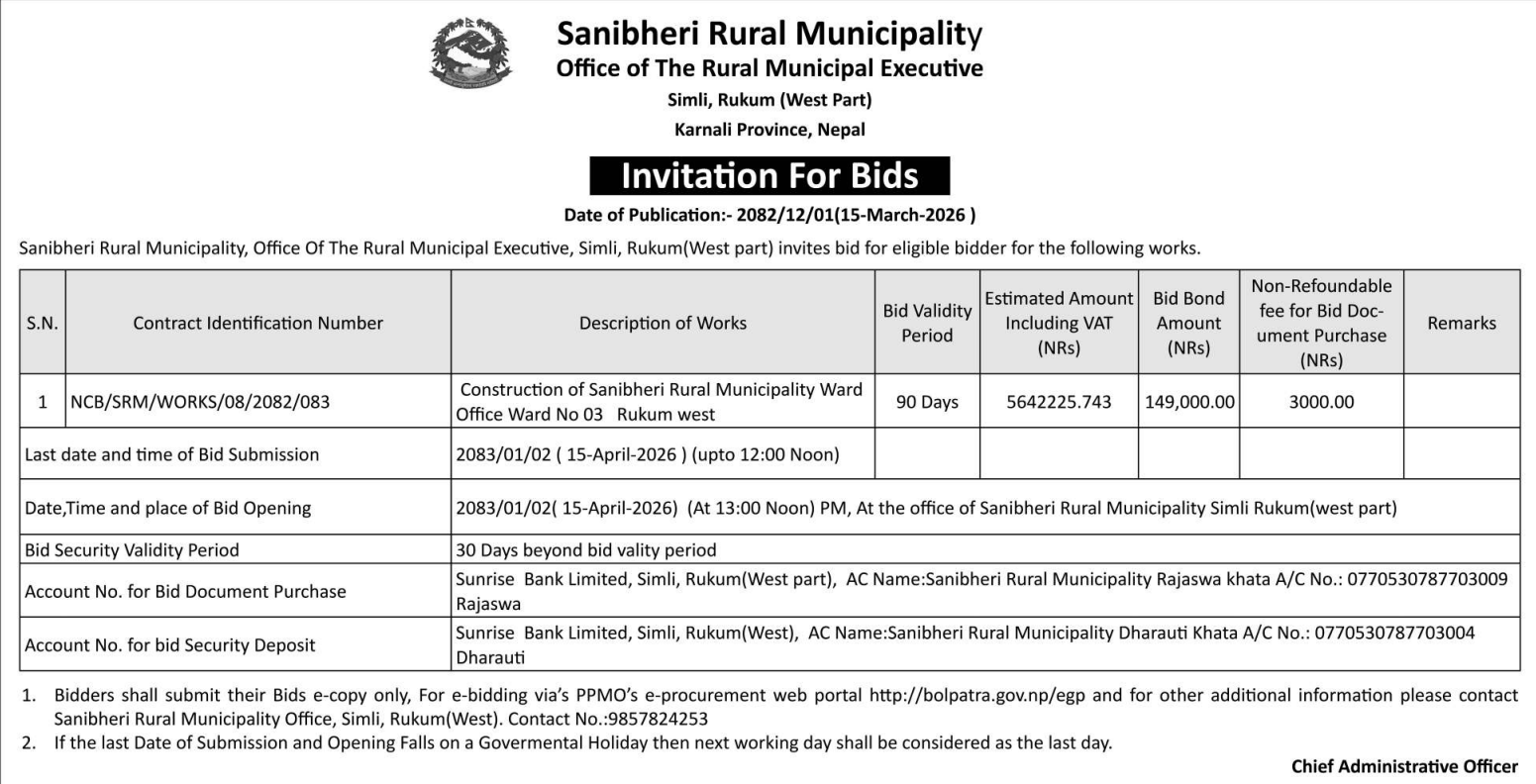| 79 | Sarumarani Rural Municipality Office, Lumbini Province, PYUTHAN; | Fikkal Beautification Phase II | 13/03/2026 | PPMO | 29/03/2026 | Click Here | |