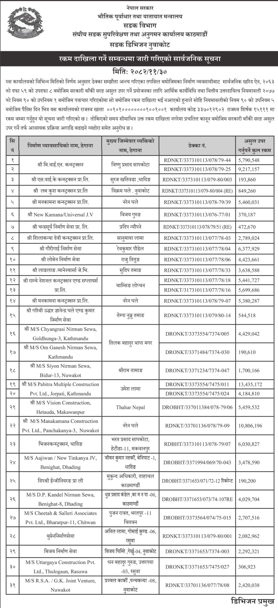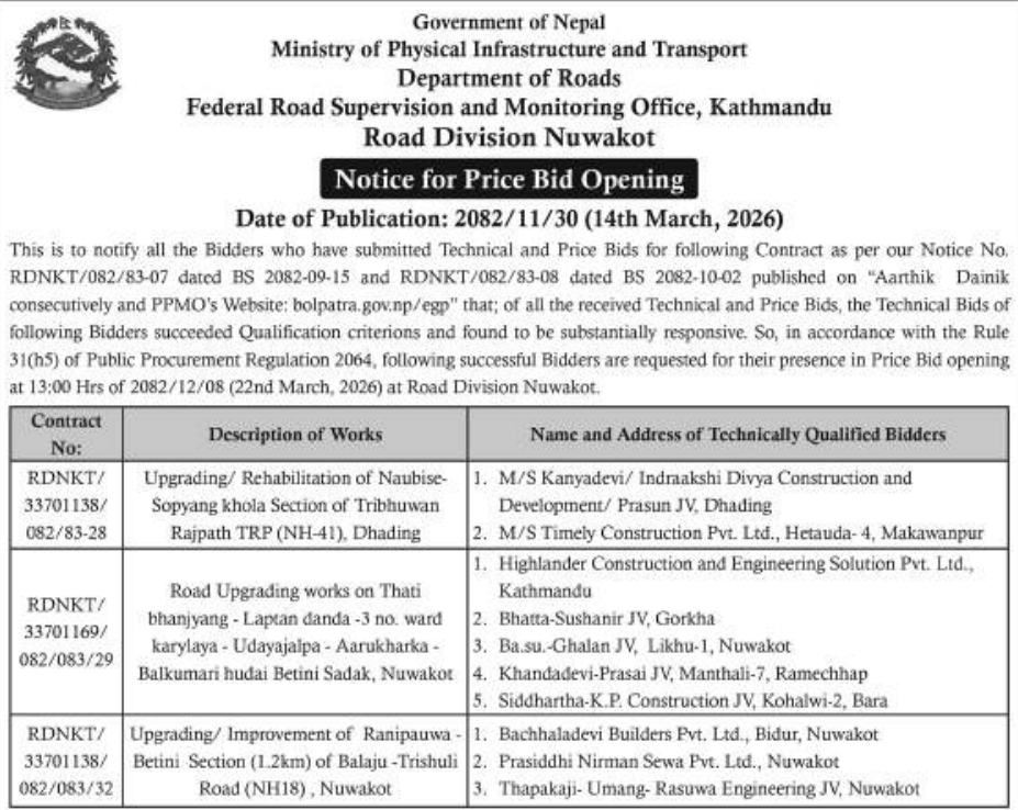 | 33 | Road Division Illam | Recurrent Works along Phidim-Gopetar-Kabeli (185+000 to 227+950, 228+000 to 252+000) | 13/03/2026 | PPMO | 12/04/2026 | Click Here | |