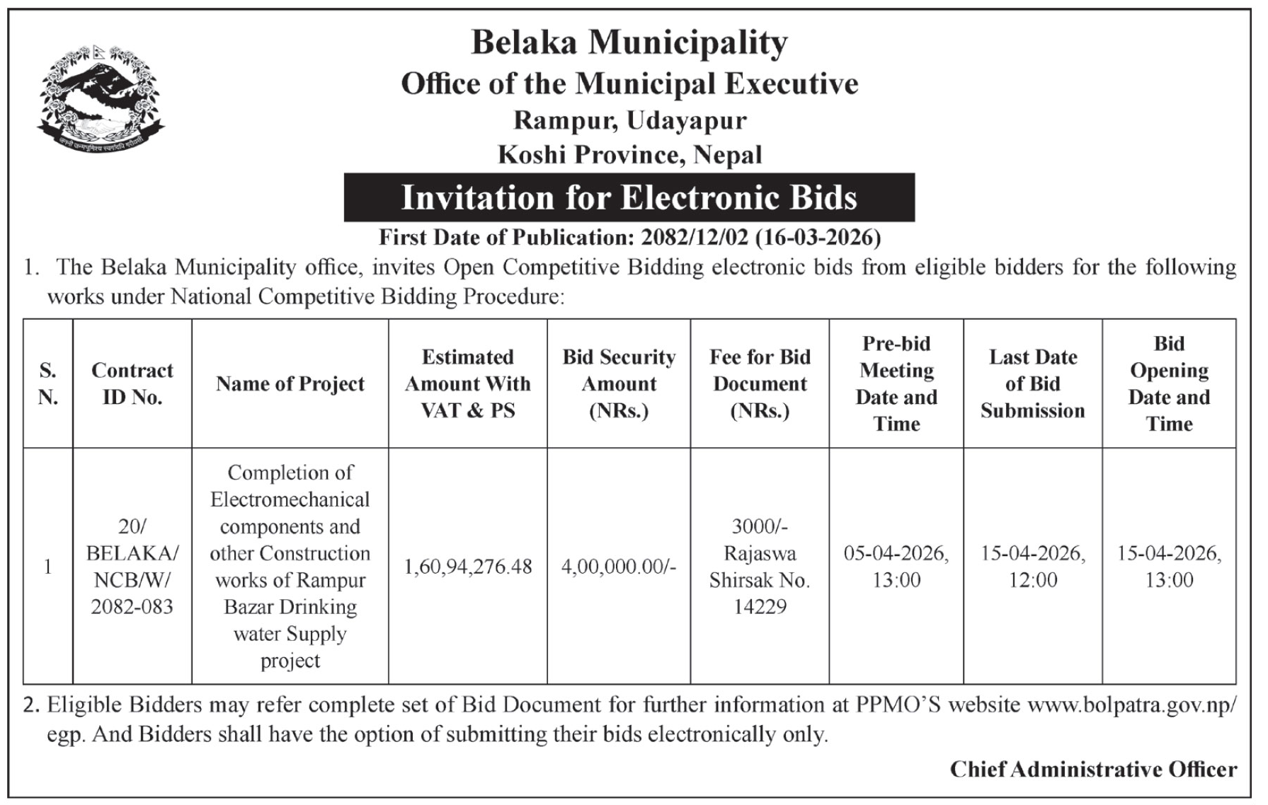 | 136 | Dhanapalthan Rural Municipality, Sorabhag, Morang | Deep boring ma submersible pump ra bidhutikaran transfermor jadan tatha pipeline karya, Dhanpalthan-3 | 15/03/2026 | PPMO | 30/03/2026 | Click Here | |