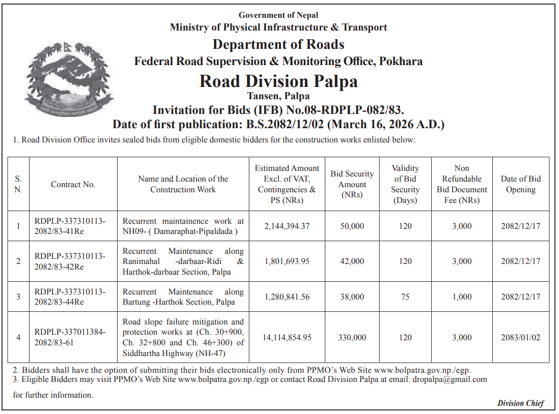 | 142 | Road Division, Pyuthan | Traffic Safety Works along Ganaha-Chakchake-Liwang-Darbot (NH-53), Chujathanthi-Khalanga-Chakchake (NH-09) & Bhingri - Sworgadwari (F-13902) | 15/03/2026 | PPMO | 30/03/2026 | Click Here | |