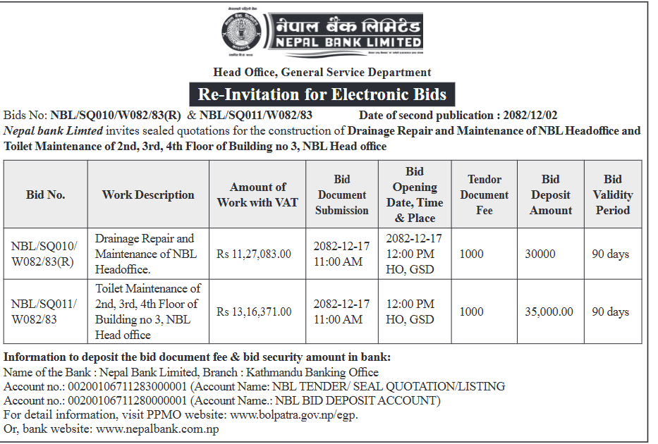| 50 | NEA, Maharajgunj Distribution Center | SUPPLY AND DELIVERY OF STATIONERY, PRINTING AND OTHERS OFFICE GOODS | 15/03/2026 | PPMO | 30/03/2026 | Click Here | |