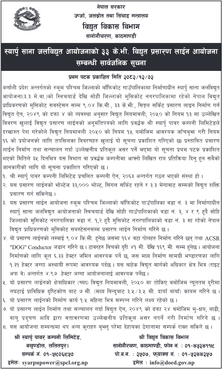 | 7 | Tatopani Rural Municipality Office, Karnali Province, JUMLA; | Tarapi Deure Shau Pharam Gherbar Nirman Tatopani Ga.Pa. 07 | 15/03/2026 | PPMO | 30/03/2026 | Click Here | |