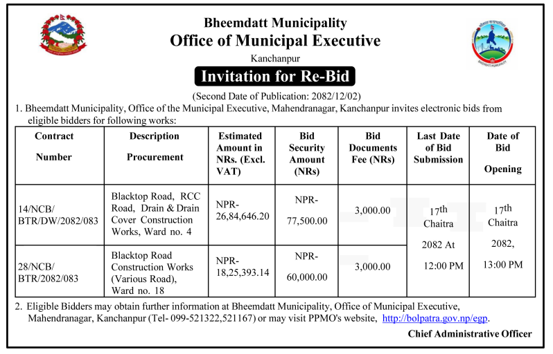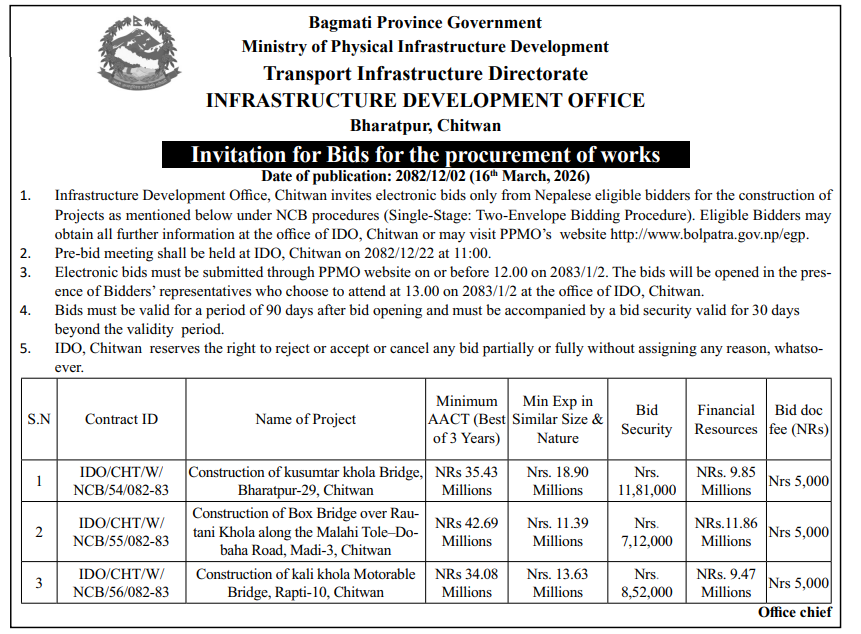 | 4 | Bharatpur Metropolitian City Office, Bagmati Province, CHITWAN; | Construction of Culvert, BMC-21 | 15/03/2026 | PPMO | 30/03/2026 | Click Here | |