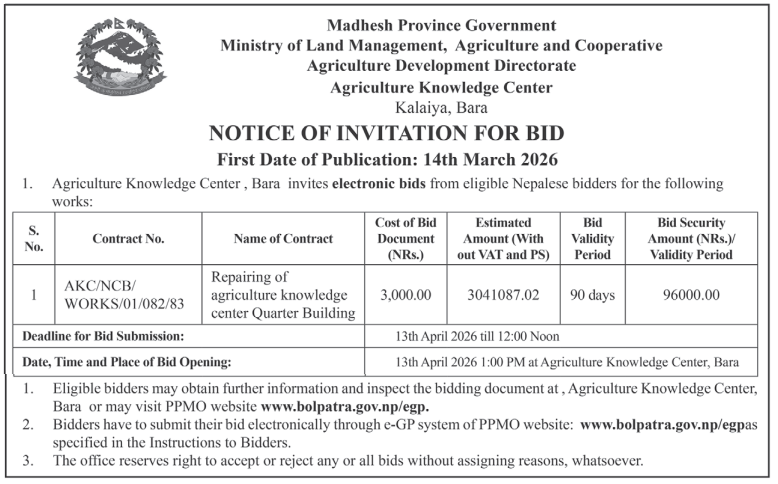 | 132 | Agriculture Knowledge Center, Bara | Repairing of agriculture knowledge center Quarter Building. | 15/03/2026 | PPMO | 13/04/2026 | Click Here | |