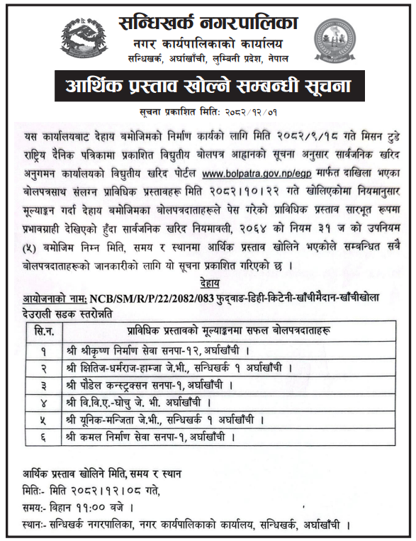 | 15 | Urban Development and Building Office, Rupandehi | Panchpheda Chatghat Construction , Pratappur -04, Nawalparasi. | 15/03/2026 | PPMO | 30/03/2026 | Click Here | |