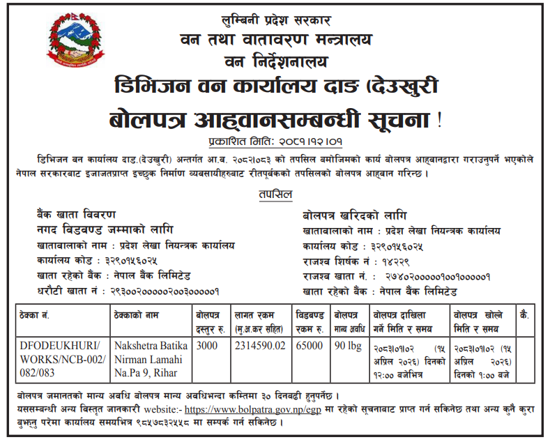 | 91 | Division forest office Dang, Deukhuri | Nakshetra Batika Nirman Lamahi Na.Pa 9, Rihar | 15/03/2026 | PPMO | 15/04/2026 | Click Here | |