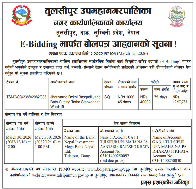 | 8 | Tulsipur Sub-Metropolitan City | Jharivarne Dekhi Basgadhi Jane Bato Cutting Tatha Starwonnati | 15/03/2026 | PPMO | 30/03/2026 | Click Here | |