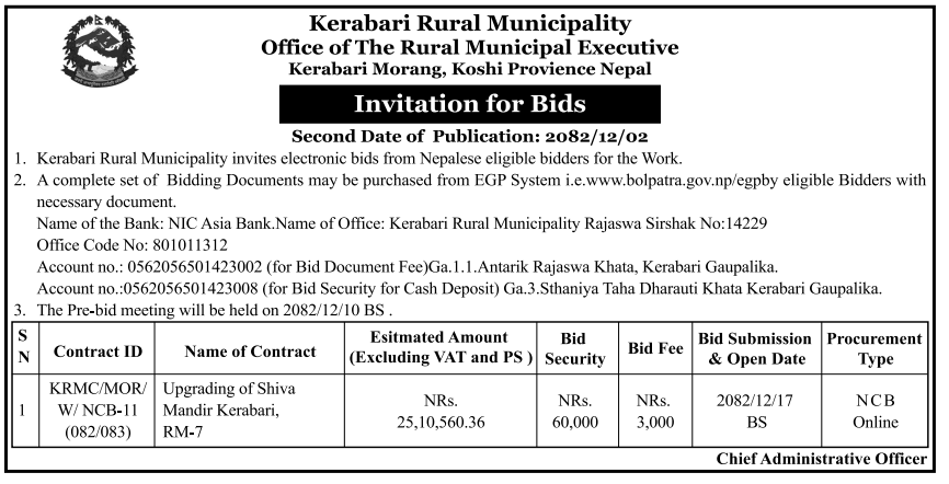 | 75 | Infrastructure Development Office, Parsa | Upgradation of Sunyagar Pagoda at Dhamma Tarai Vipassana Kendra, Birgunj-21 | 15/03/2026 | PPMO | 16/04/2026 | Click Here | |