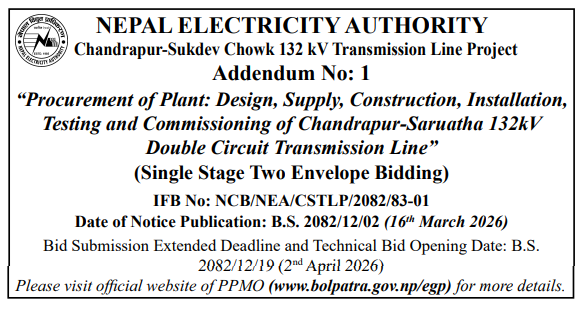 | 155 | NEA, Lekhnath Damauli 220 kv Transmission Line Project | Construction of Truss type Vehicle Parking Shed at Lekhnath | 15/03/2026 | PPMO | 30/03/2026 | Click Here | |